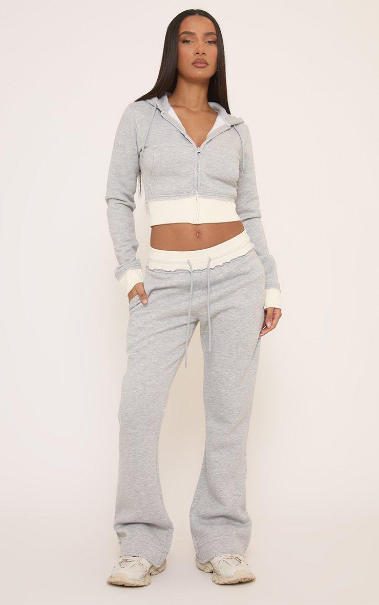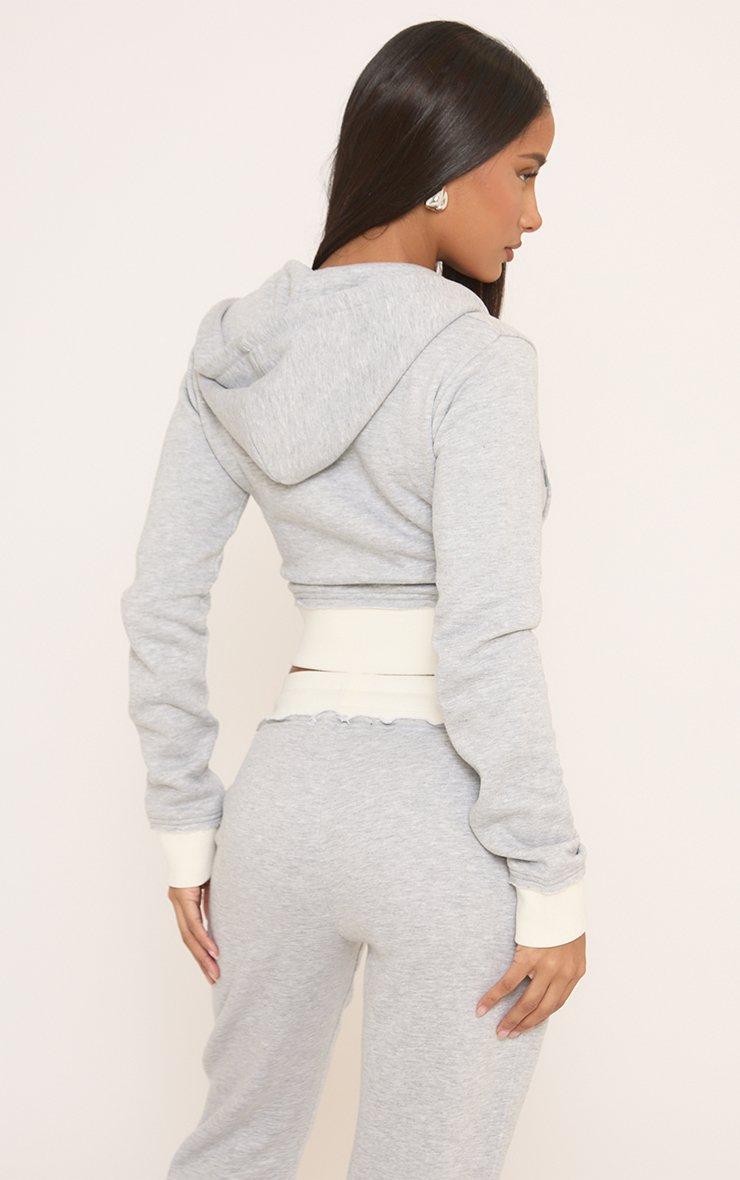 Contrast Distressed Detail Cropped Zip Up Hoodie In Light Grey