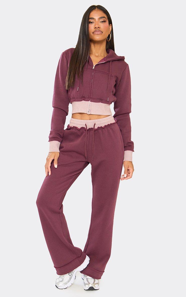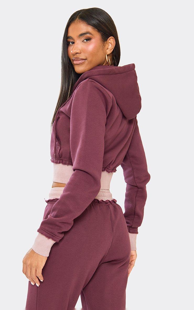 Contrast Distressed Detail Cropped Zip Up Hoodie In Plum