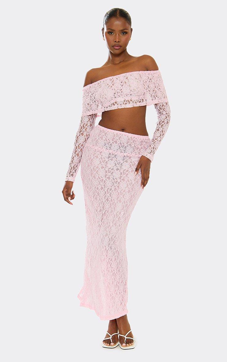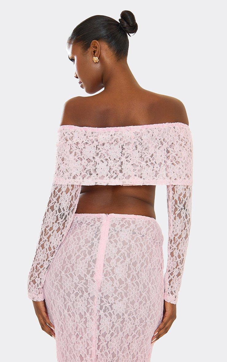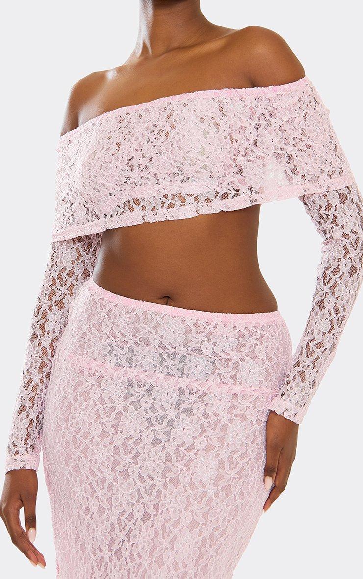 Fold Over Bardot Long Sleeve Crop Top In Baby Pink Lace