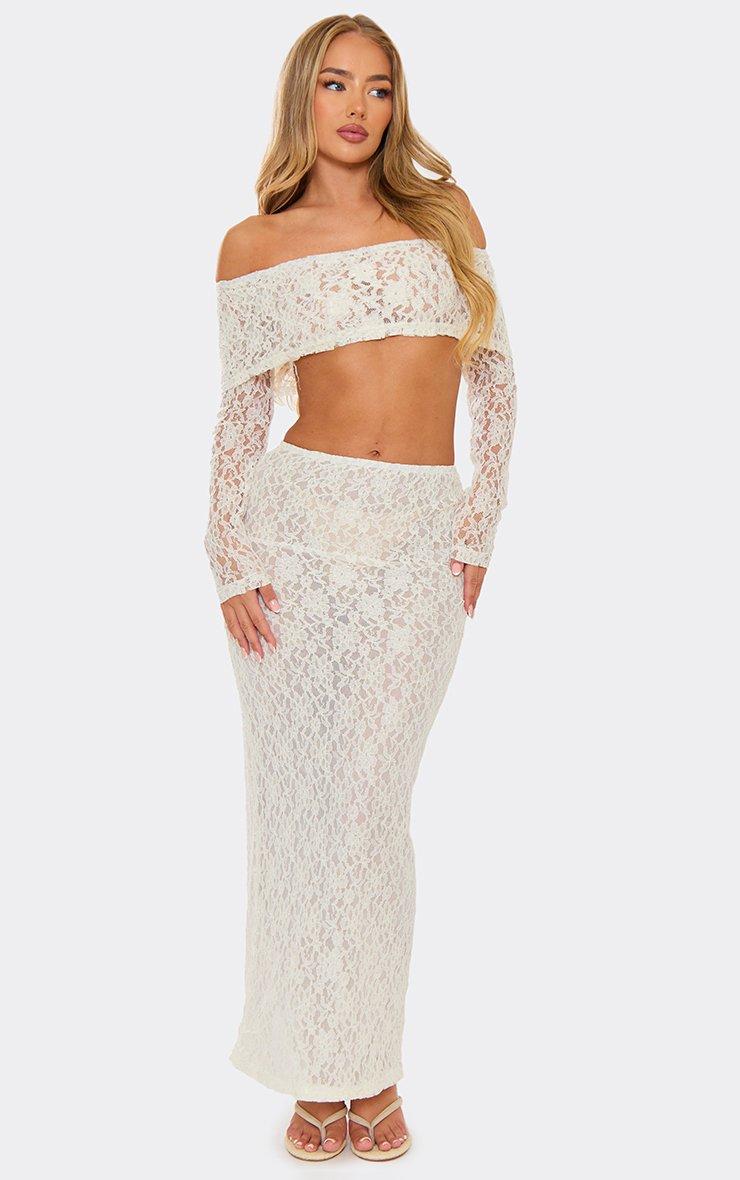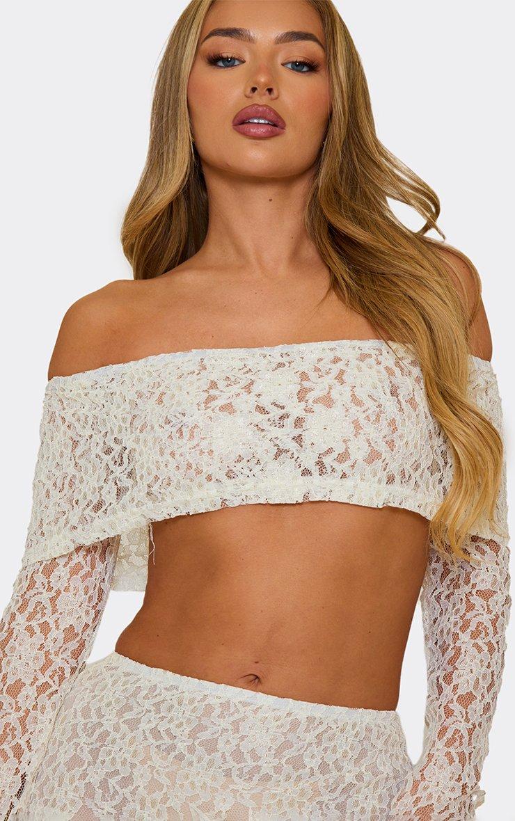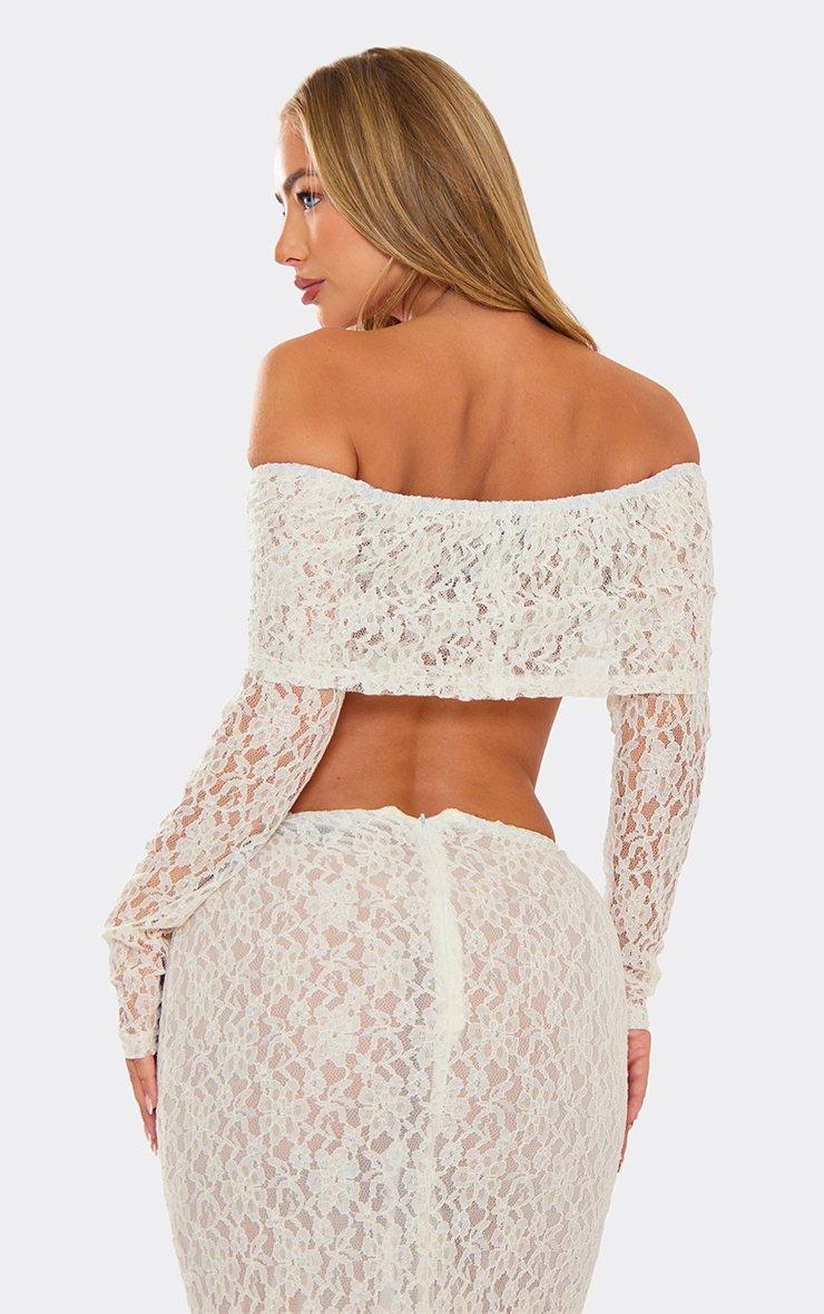 Fold Over Bardot Long Sleeve Detail Crop Top In White Lace