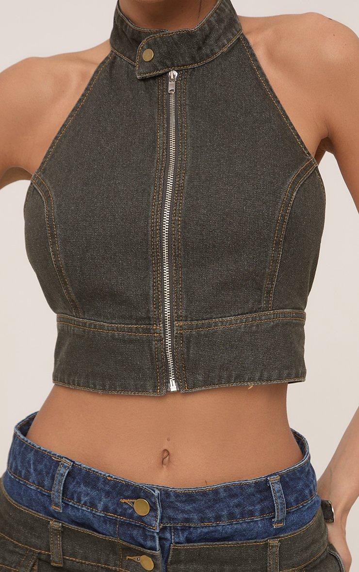 High Neck Zip Front Sleeveless Top In Blue Denim