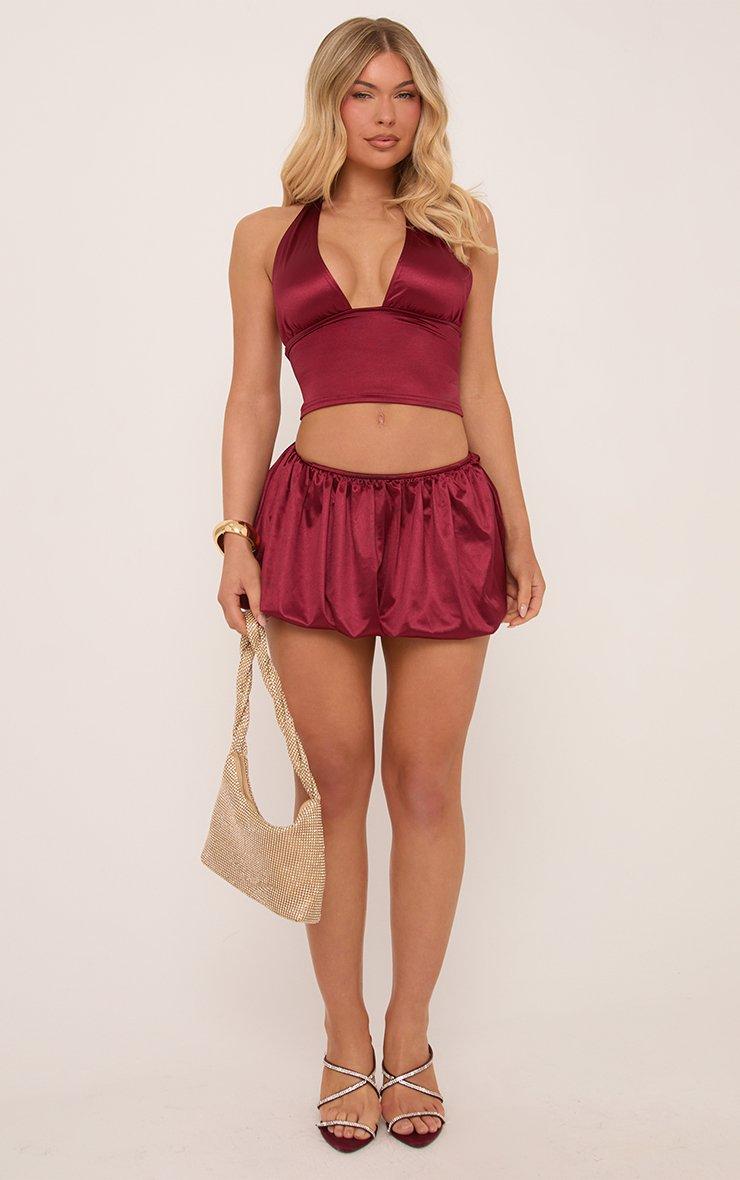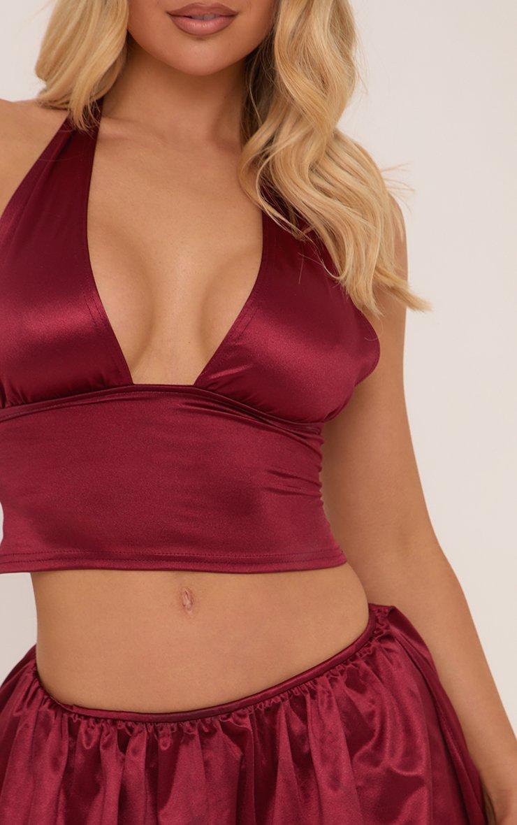 Plunge Halterneck Open Back Crop Top In Burgundy Disco Slinky