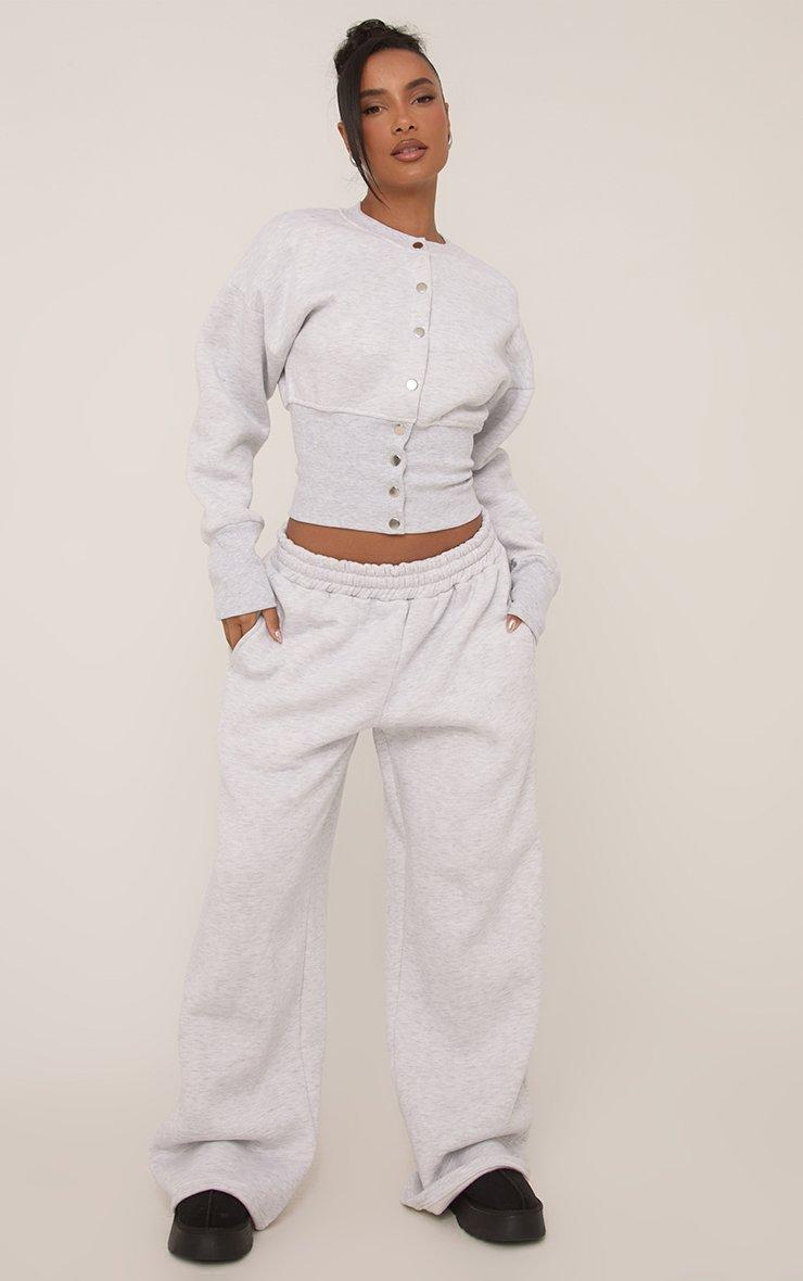 Mid Rise Pocket Detail Wide Leg Joggers In Light Grey Marl