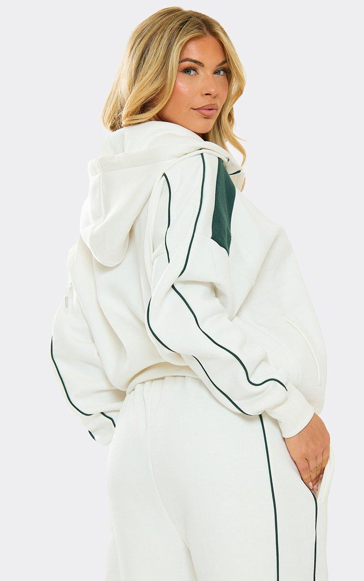 Green Contrast Stripe Zip Through Oversized Hoodie In Cream