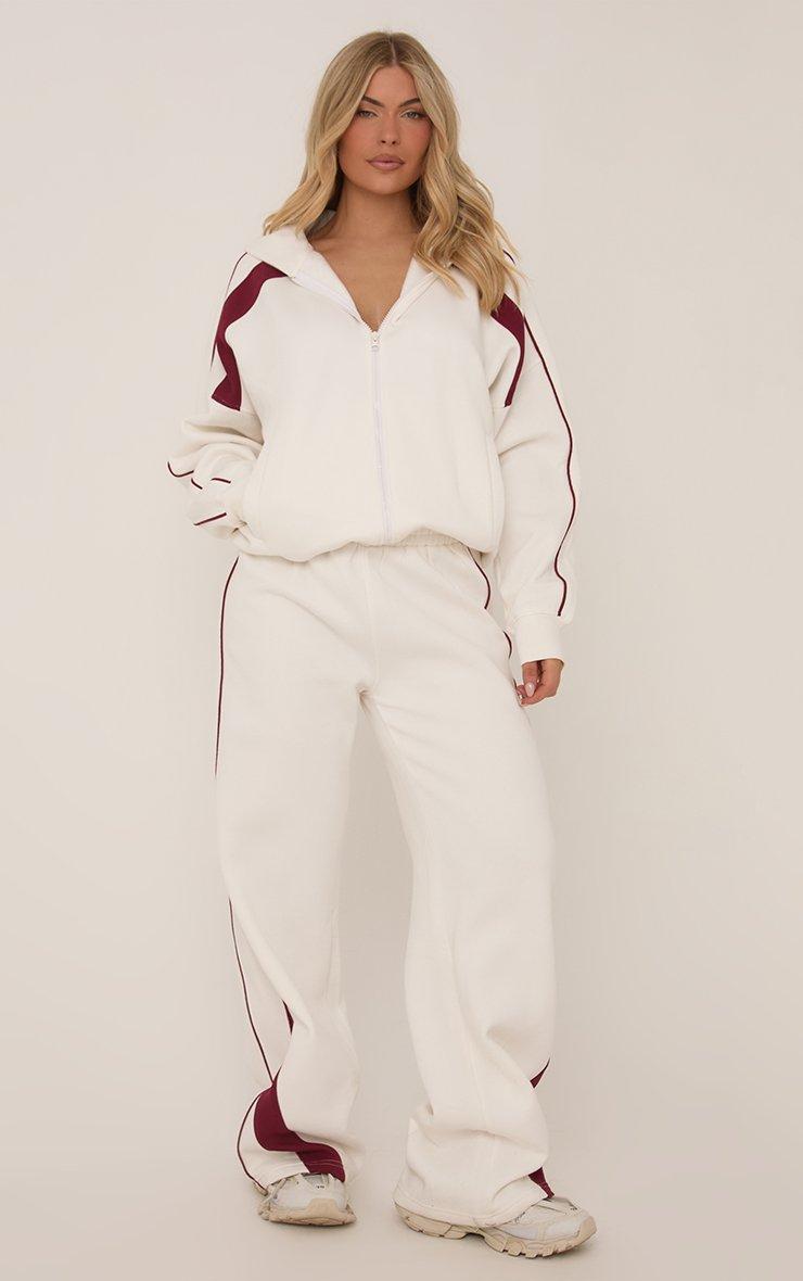 Burgundy Contrast Stripe Straight Leg Joggers In Cream