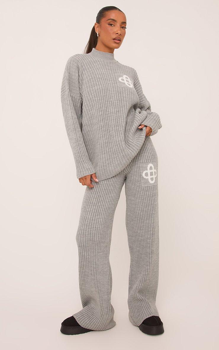 Mid Waist Ego Graphic Straight Leg Trousers In Grey Knit