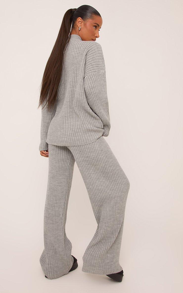 Tie Waist Wide Leg Trousers In Grey Rib Knit