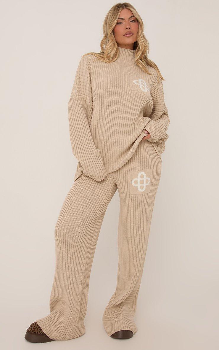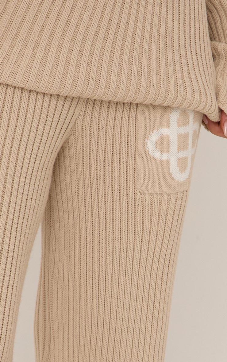High Waist Swirl Graphic Wide Leg Trousers In Stone Rib Knit