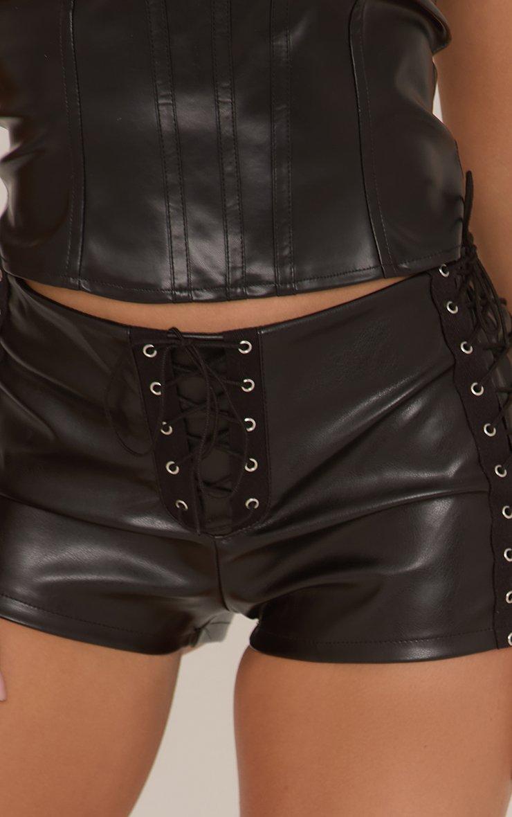 Mid Rise Lace Up Detail Hot Pants In Black Faux Leather