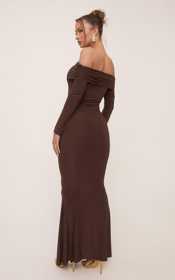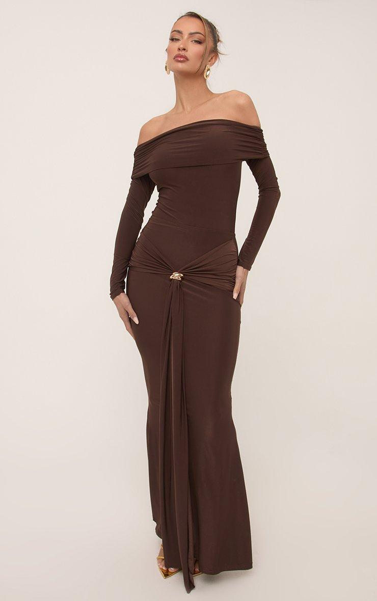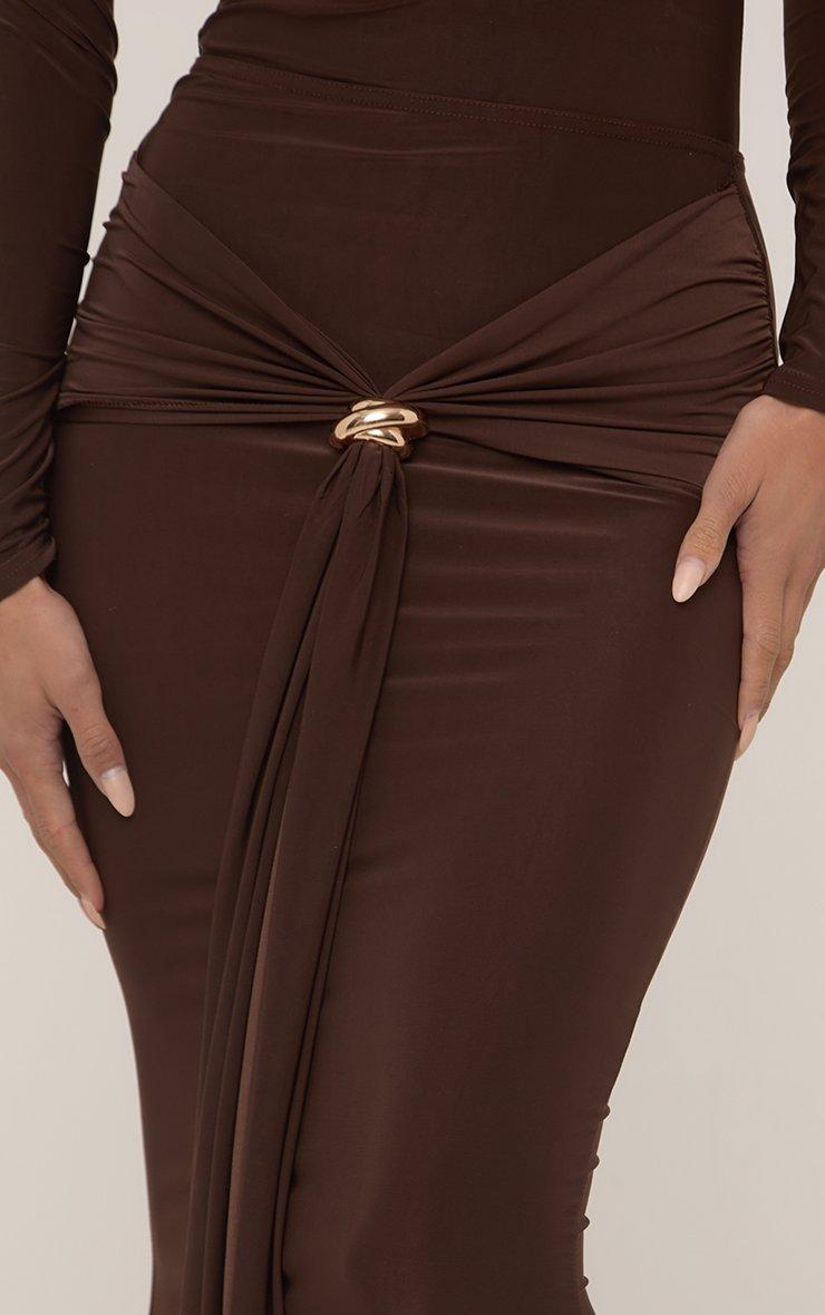Mid Waist Trim Detail Maxi Skirt In Chocolate Brown Slinky