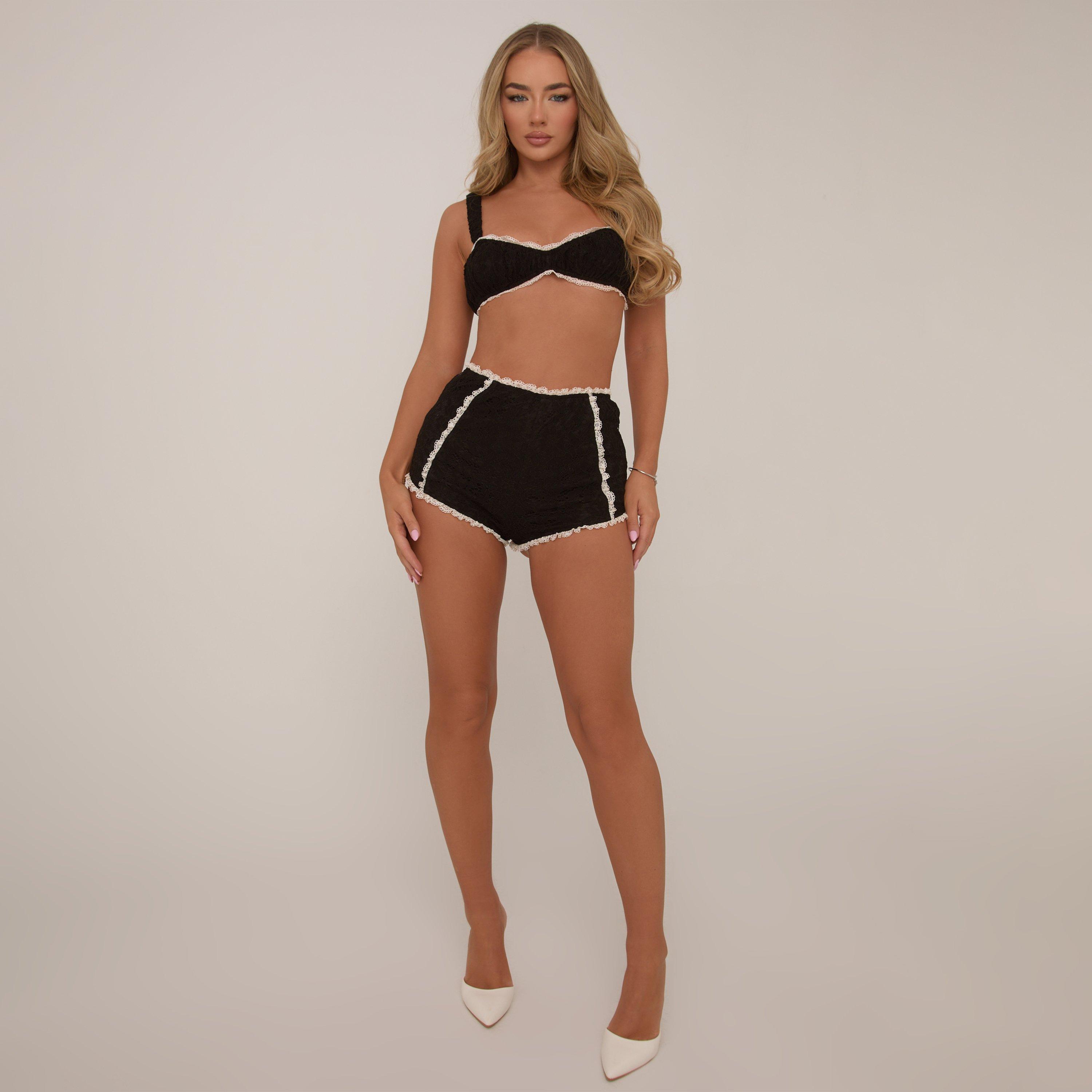 High Waist Contrast Frilled Trim Detail Shorts In Black Lace