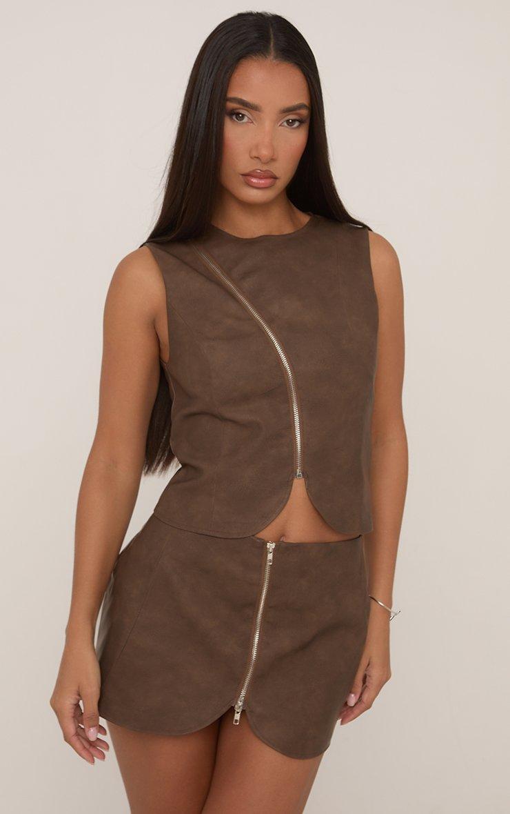 Mid Rise Zip Front Asymmetric Mini Skirt In Brown Faux Leather