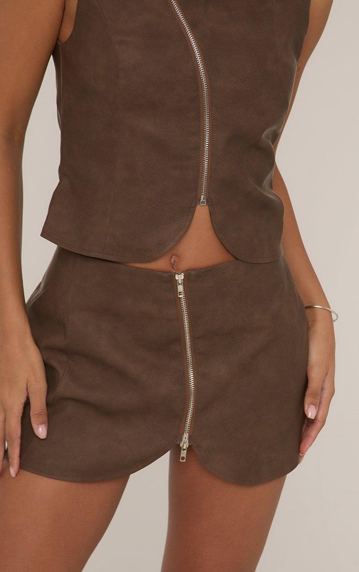 mid rise zip front asymmetric mini skirt in brown faux leather
