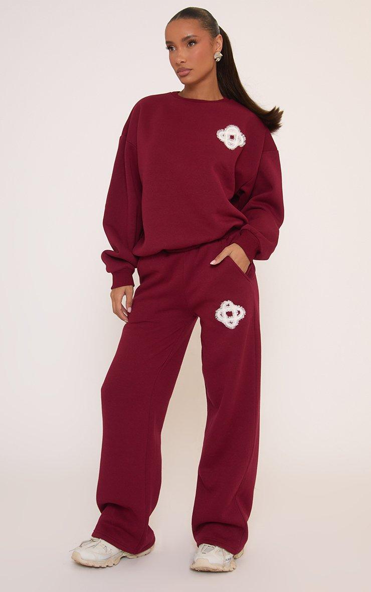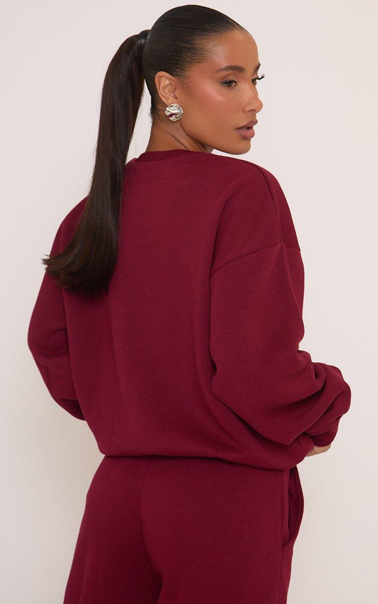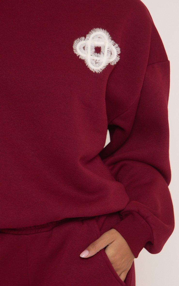 Long Sleeve Crew Neck Fluffy Swirl Detail Sweatshirt In Burgundy