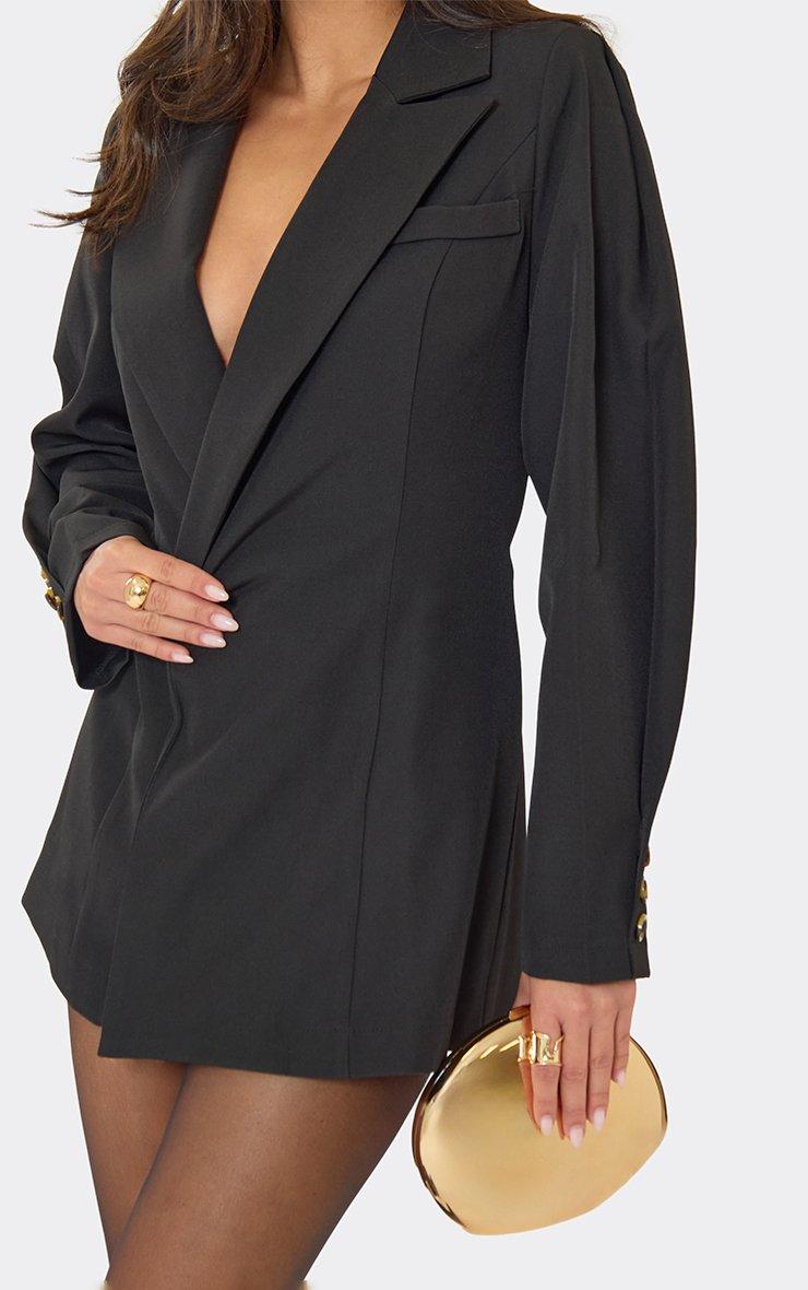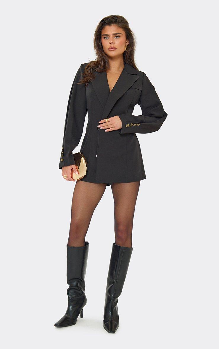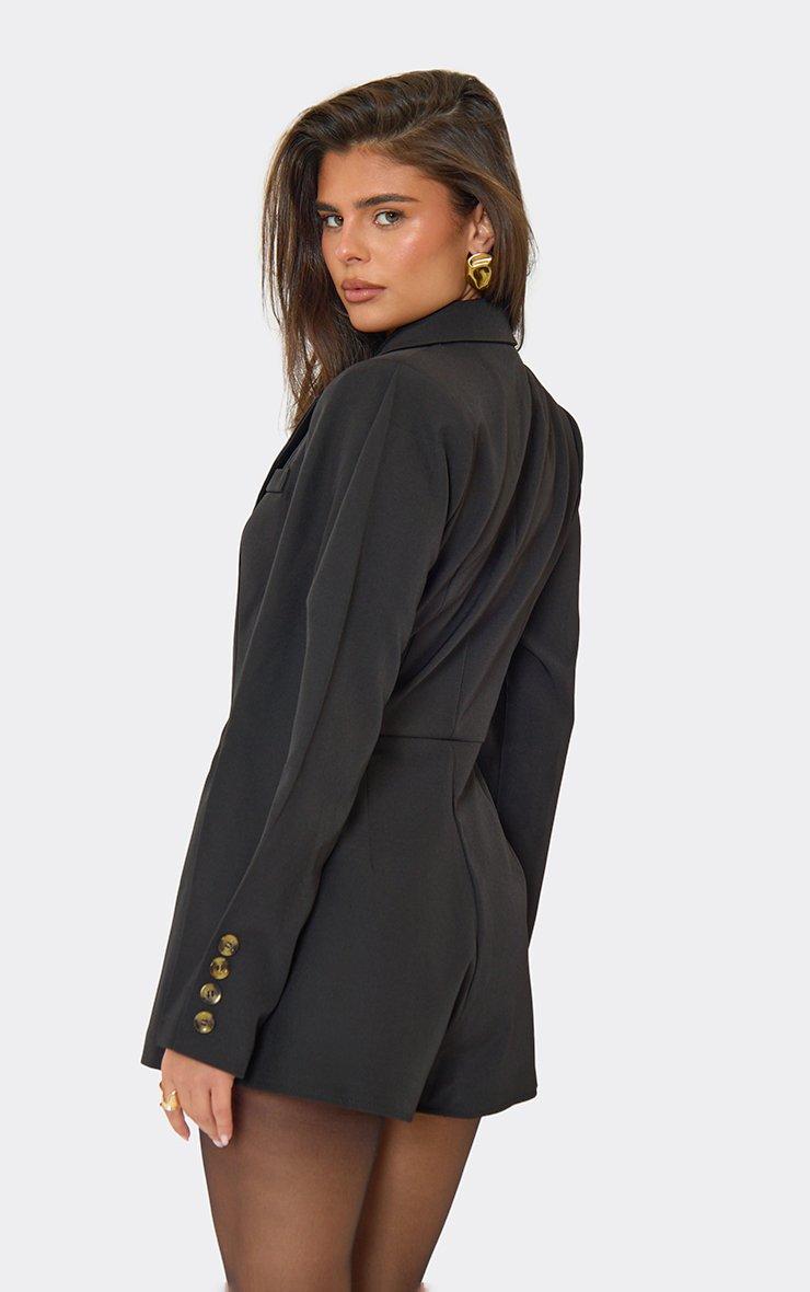 Long Sleeve Pocket Detail Wool Look Blazer Playsuit In Black