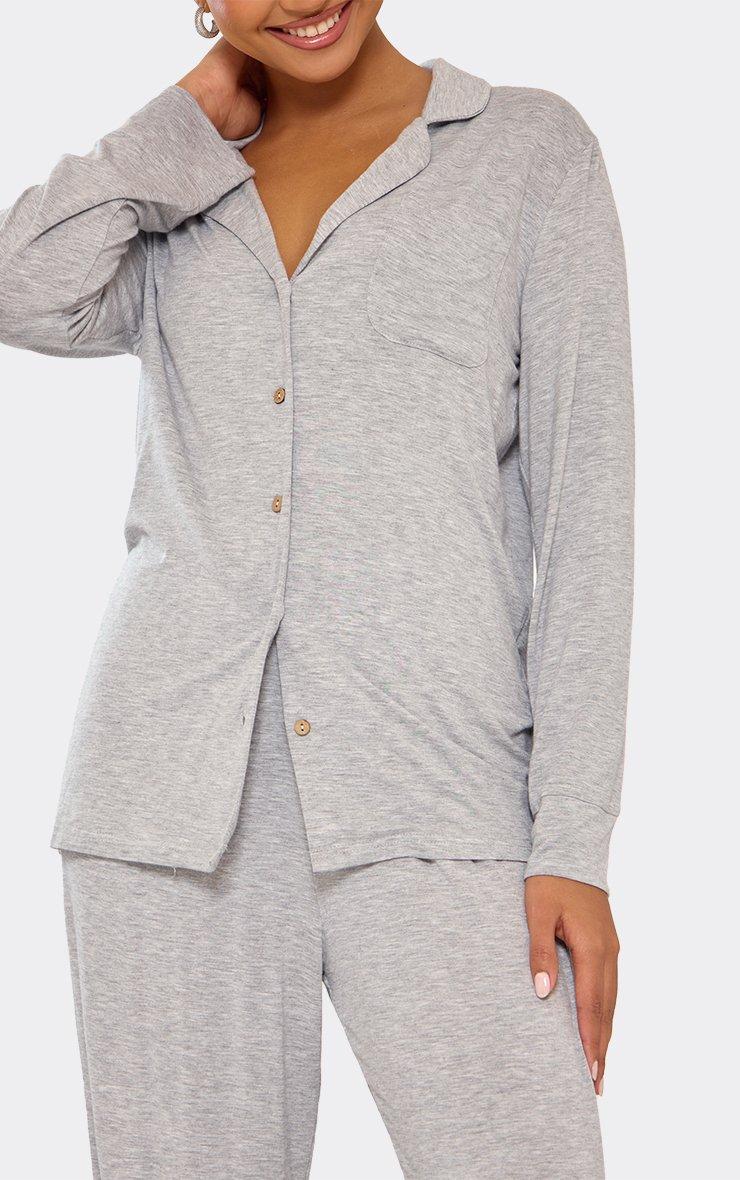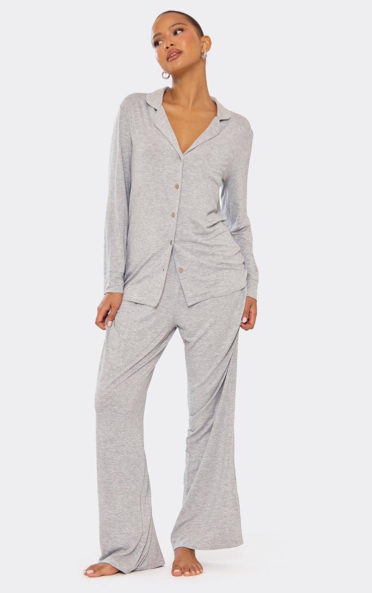 Long Sleeve Shirt And Straight Leg Trousers Pyjama Set In Grey