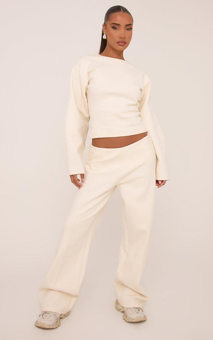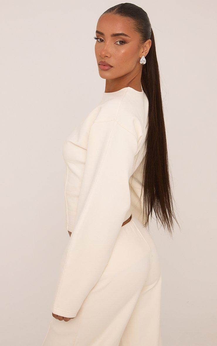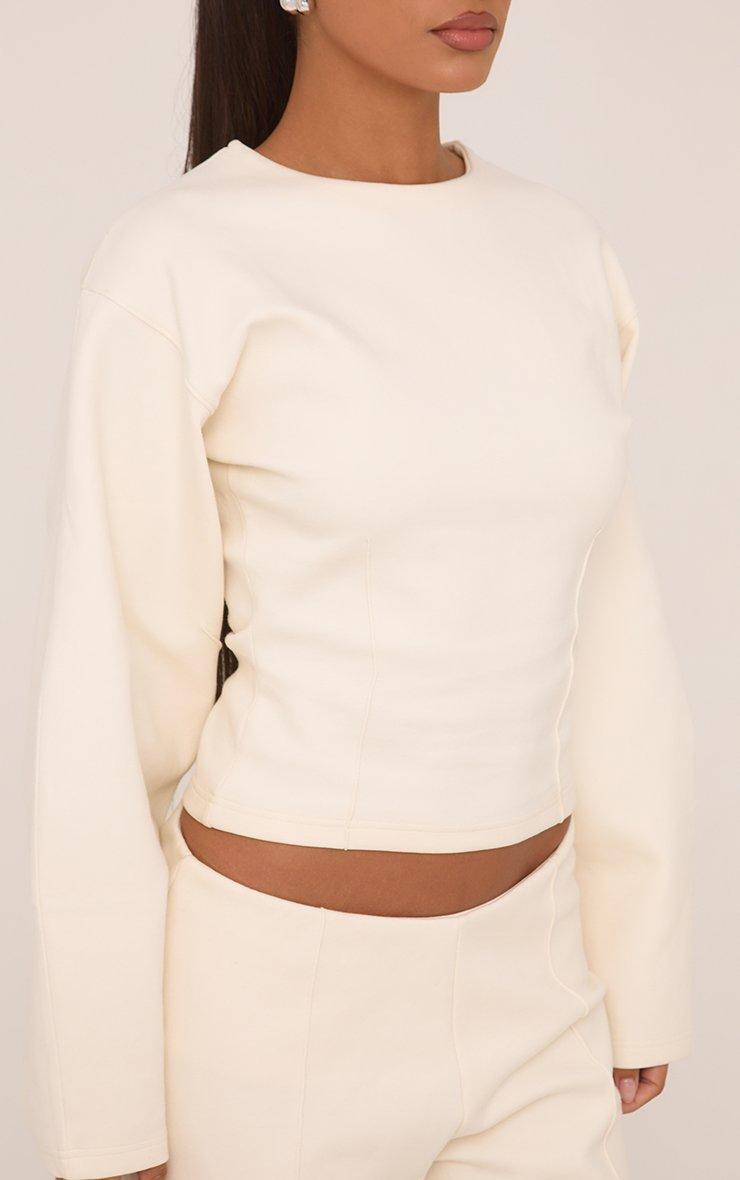 Long Sleeve Contrast Piping Detail Cropped Sweatshirt In Cream