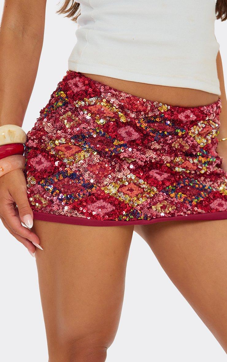 Mid Rise Mini Skirt In Burgundy Disc Sequin