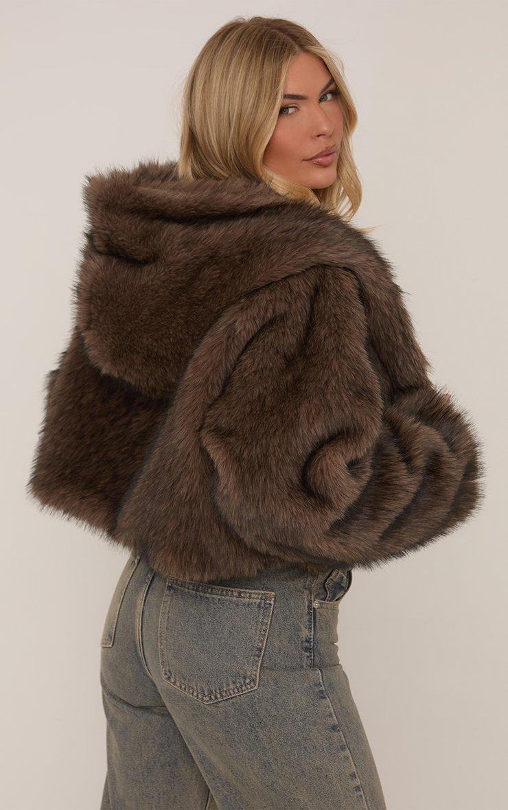 Hooded Cropped Jacket In Chocolate Brown Faux Fur