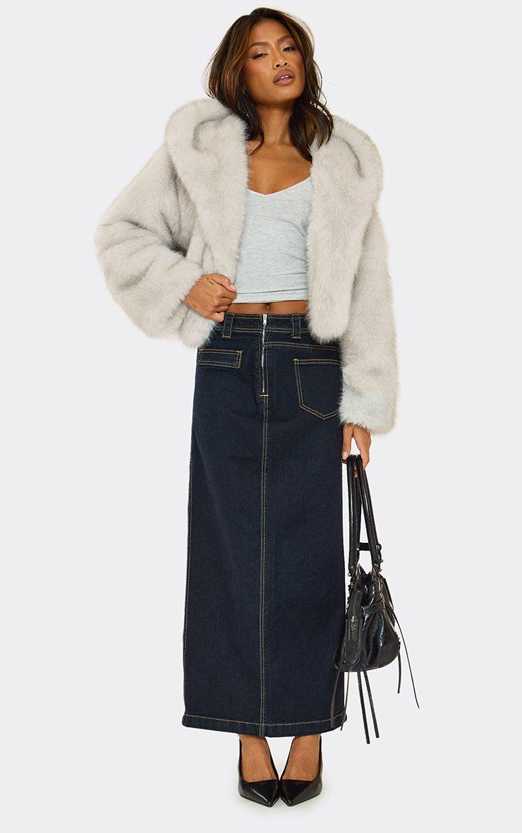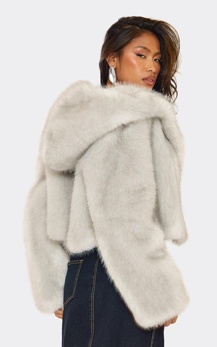 Hooded Cropped Jacket In Light Grey Faux Fur