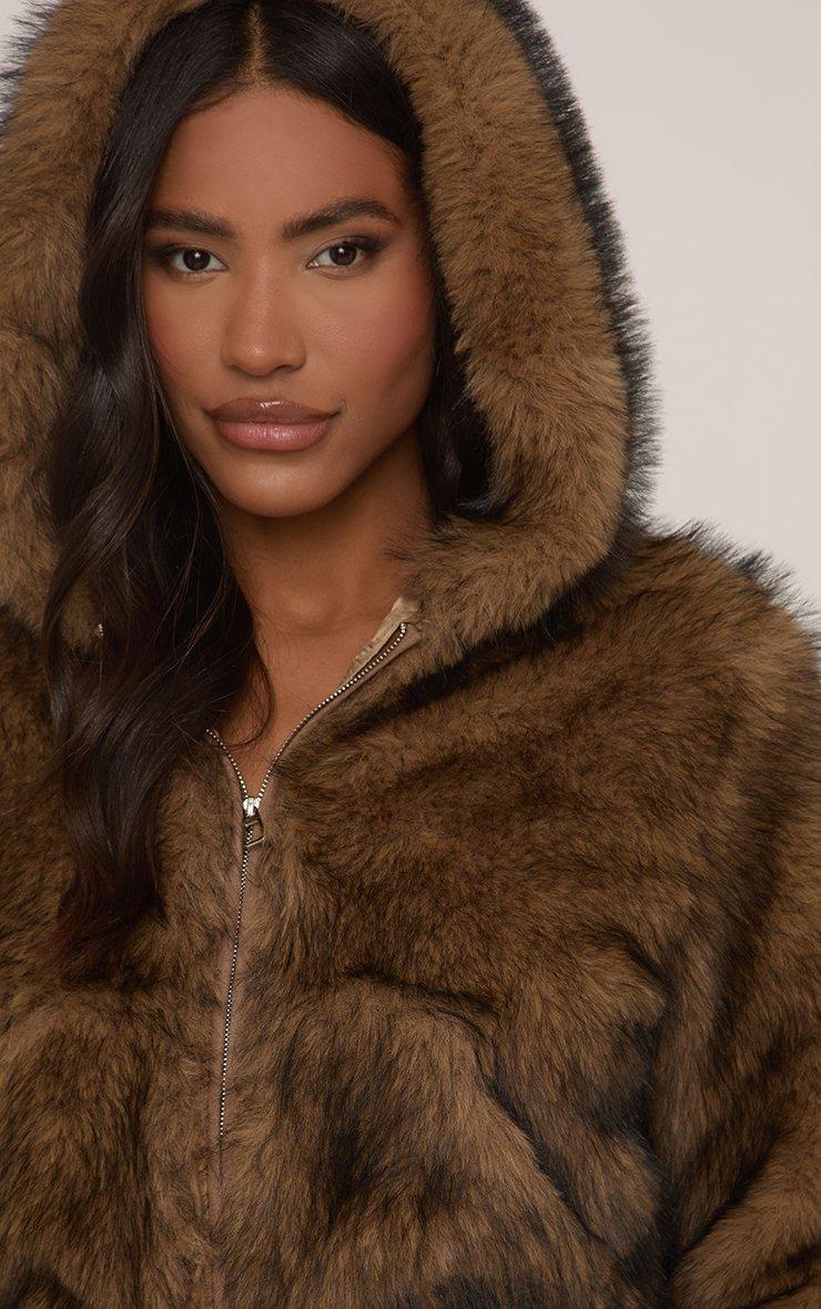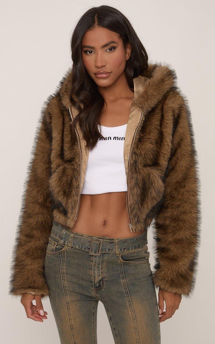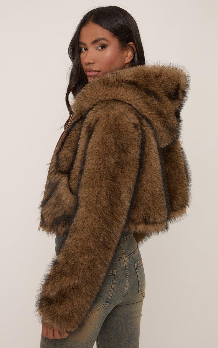 Long Sleeve Zip Front Hooded Jacket In Brown Faux Fur