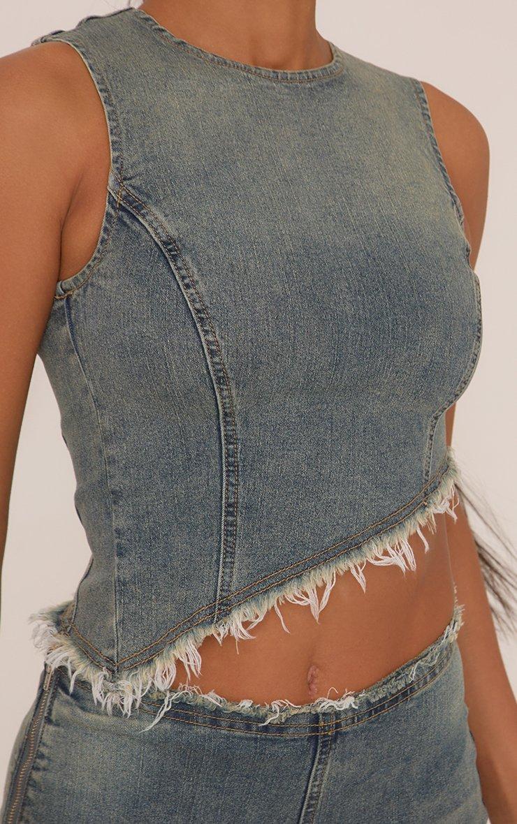 Sleeveless Frayed Asymmetric Hem Detail Top In Blue Denim