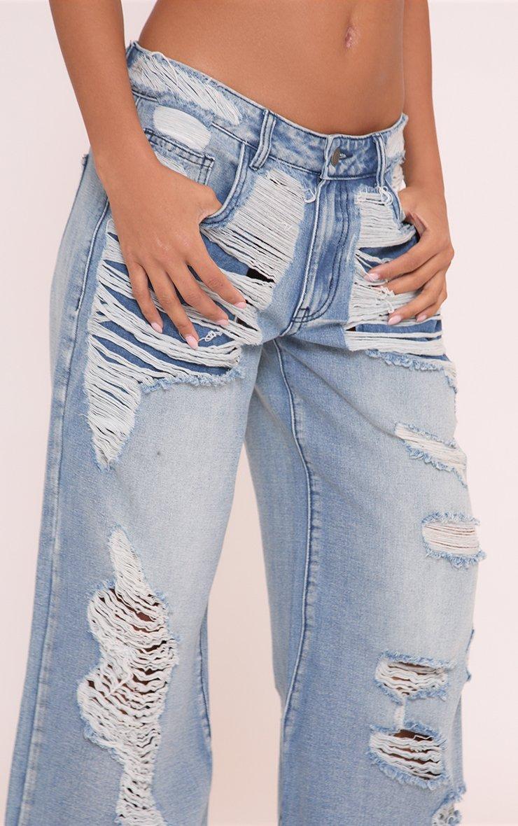 Extreme Low Rise Distressed Hem Detail Boyfriend Jeans In Blue Denim