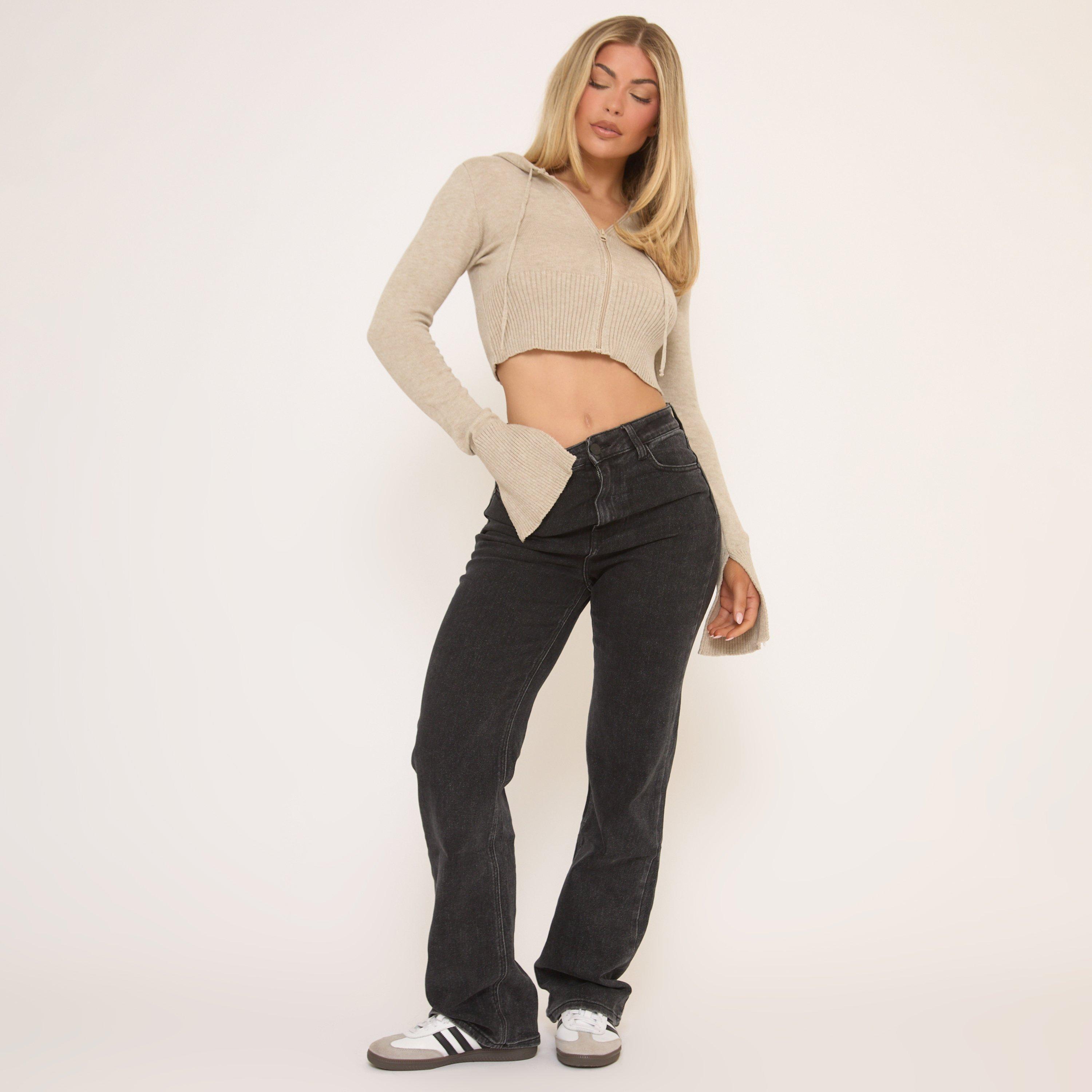 Mid Rise Zip Detail Wide Leg Jeans In Washed Black Denim