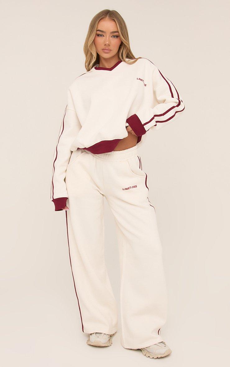 high waist contrast burgundy stripe wide leg joggers in cream