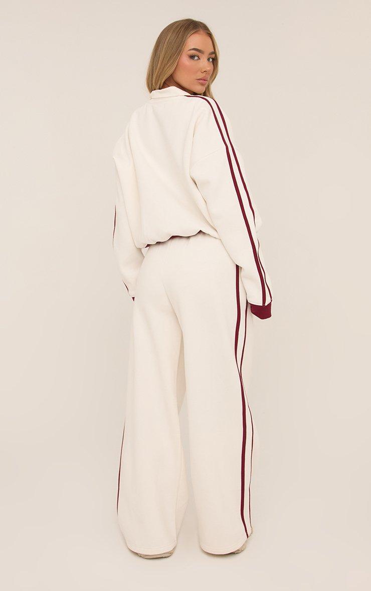 High Waist Contrast Burgundy Stripe Wide Leg Joggers In Cream
