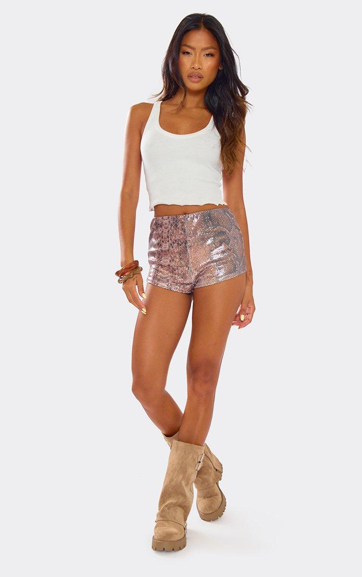 Mid Rise Hot Pant Shorts In Brown Animal Sequin