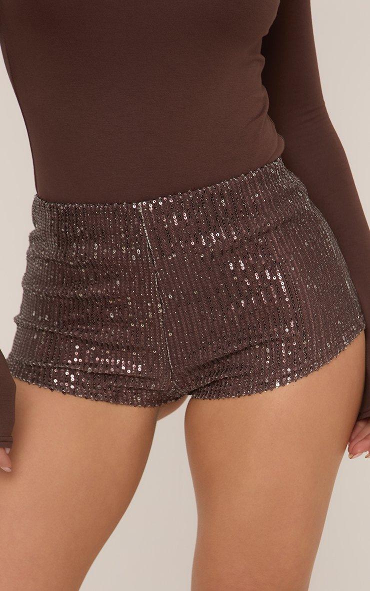 Low Waist Micro Shorts In Chocolate Brown Sequin