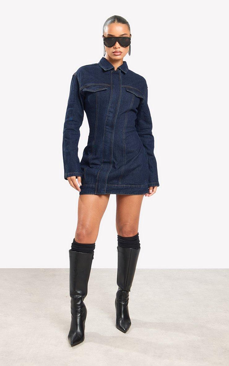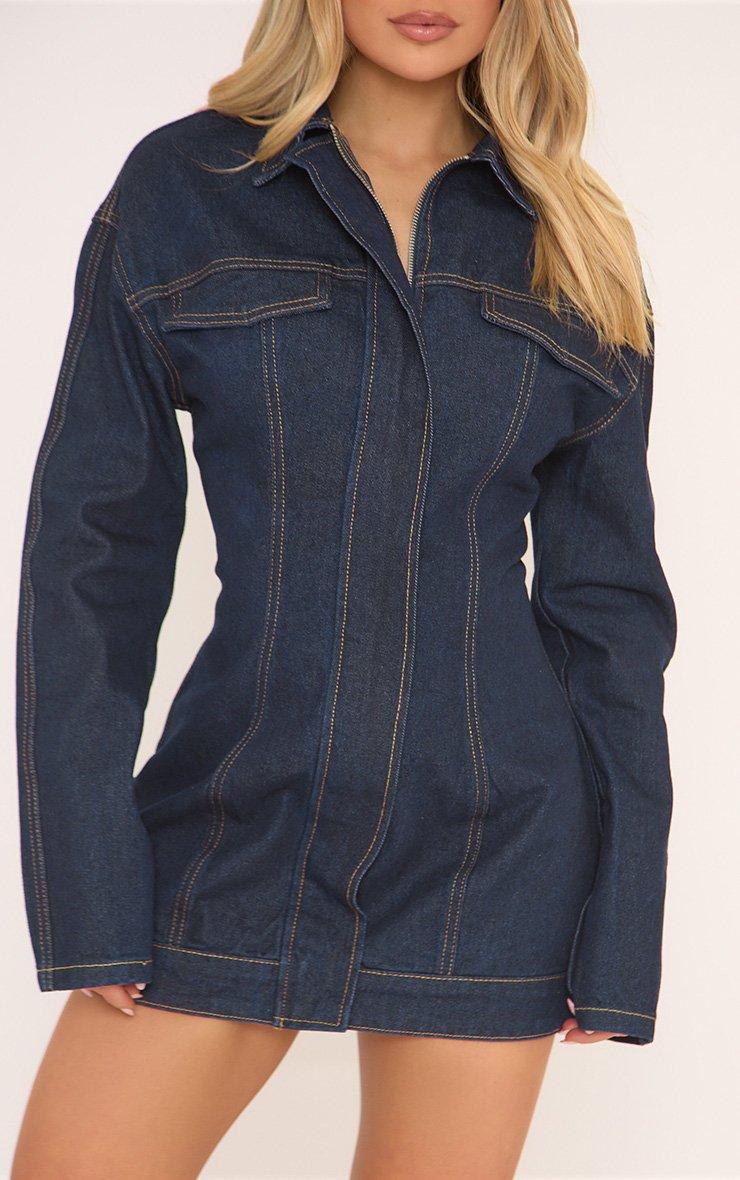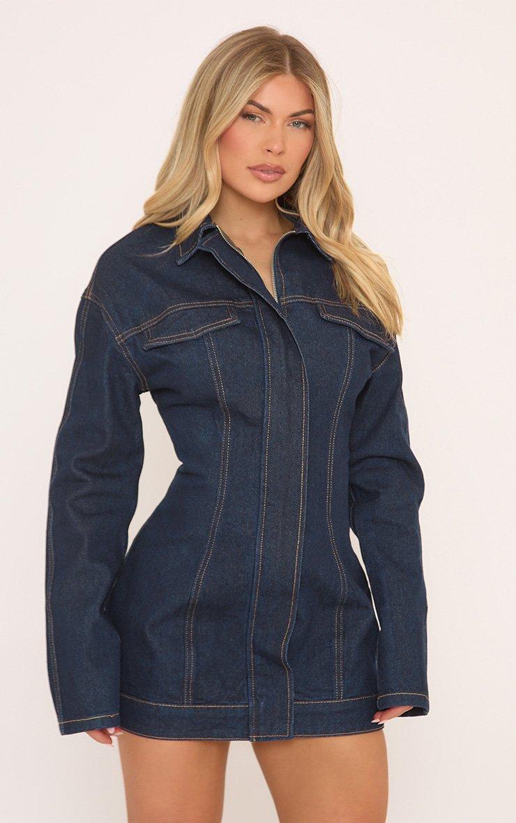 Long Sleeve Cinch Waist Mini Dress In Dark Blue Denim