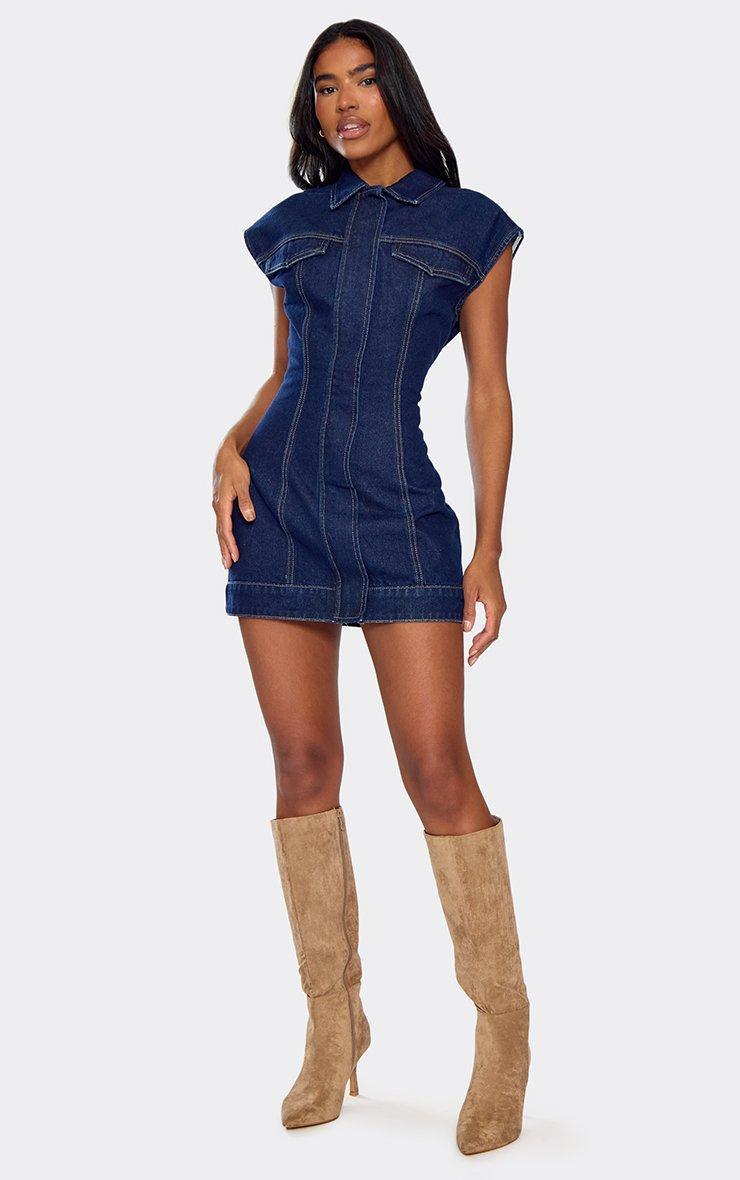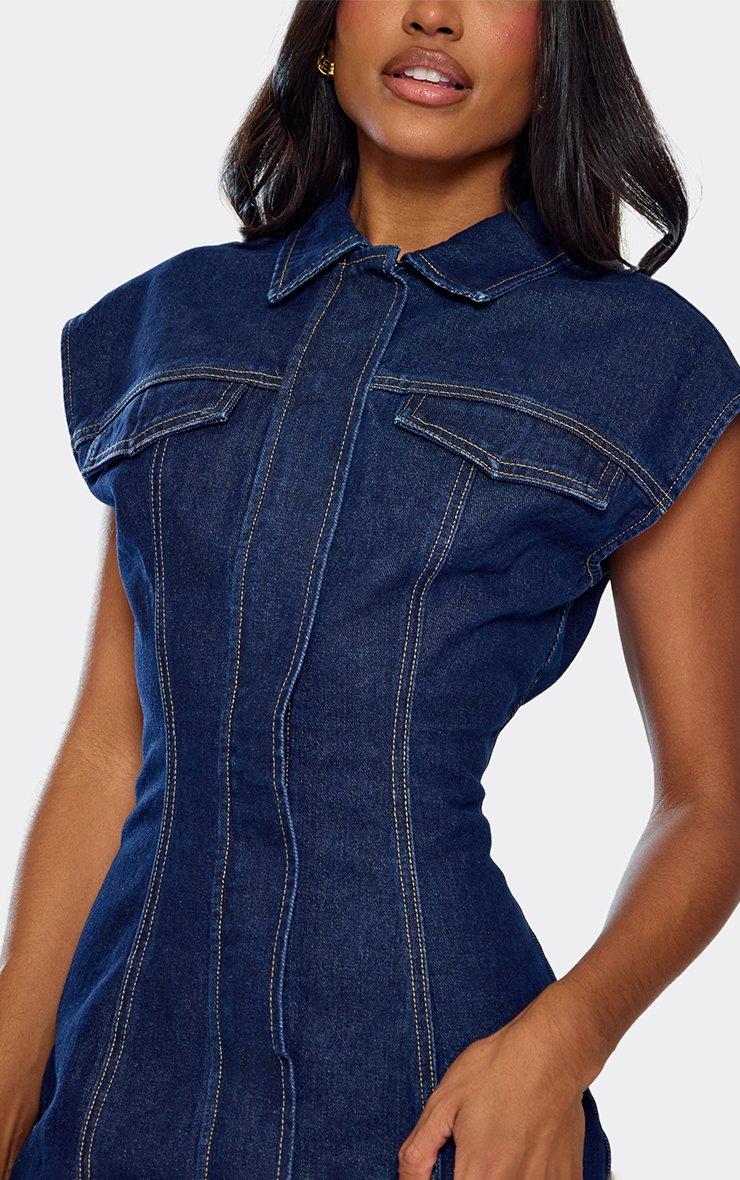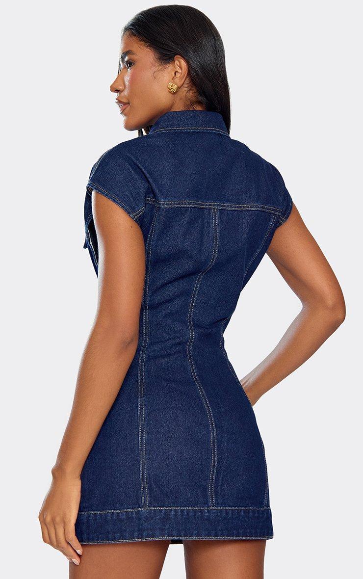 Short Sleeve Cinched Waist Detail Mini Dress In Indigo Blue Denim