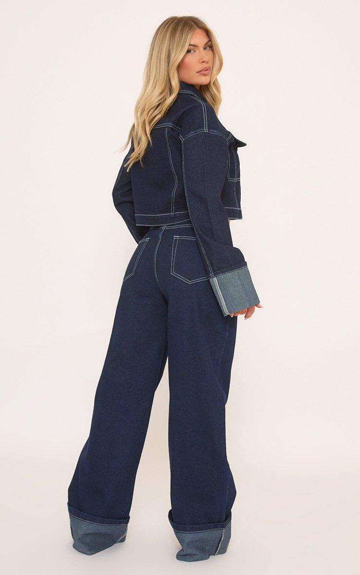 Mid Rise Turn Up Hem Wide Leg Jeans In Dark Blue Denim