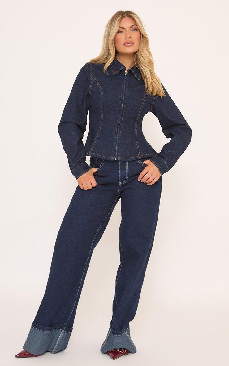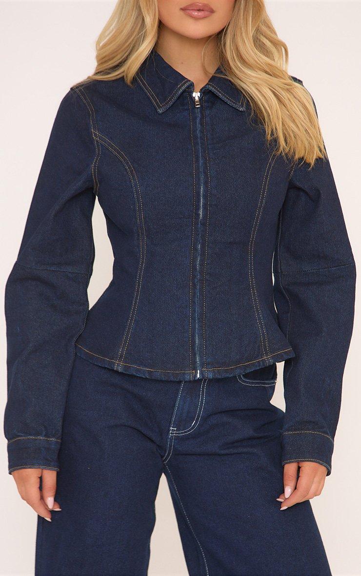 Long Sleeve Cinch Waist Collared Top In Dark Blue Denim