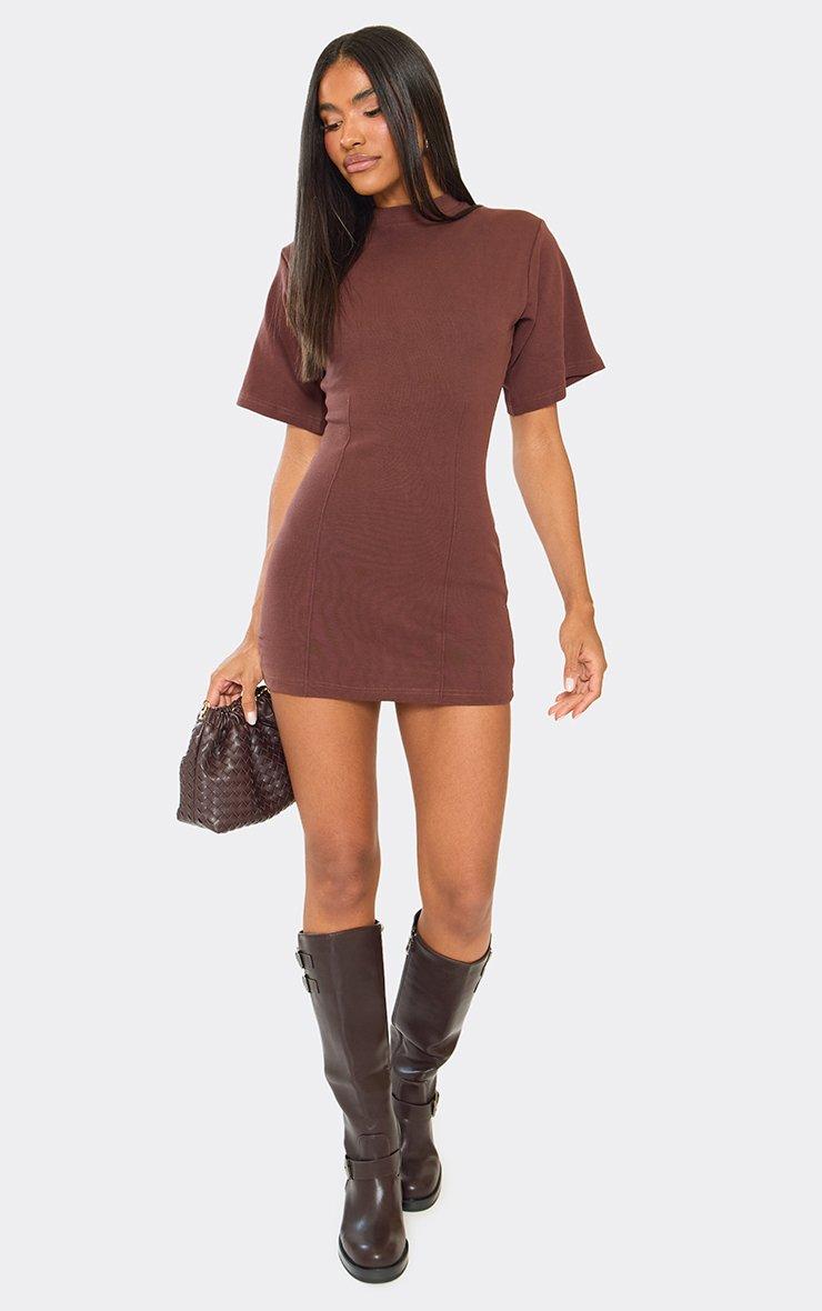 Sleeveless Plunge Halterneck Tailored Mini Dress In Chocolate Brown