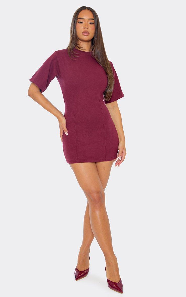 Short Boxy Sleeve Shoulder Pads Seam Detail Sweat Mini Dress In Burgundy