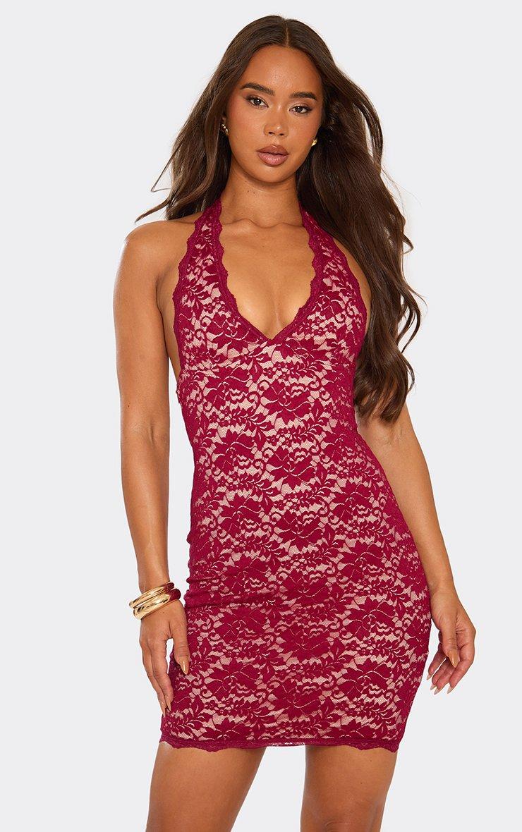Plunge Neck Contrast Mini Bodycon Dress In Burgundy Lace