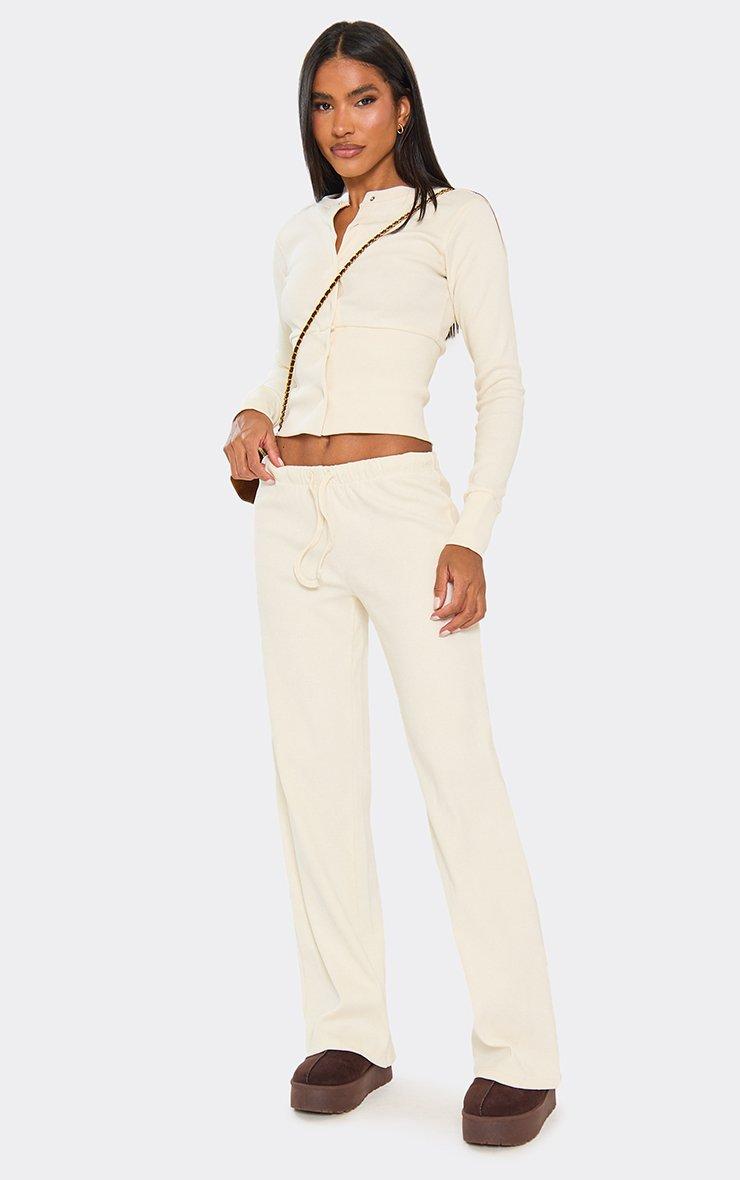 Drawstring Waist Straight Leg Trousers In Cream Ribbed