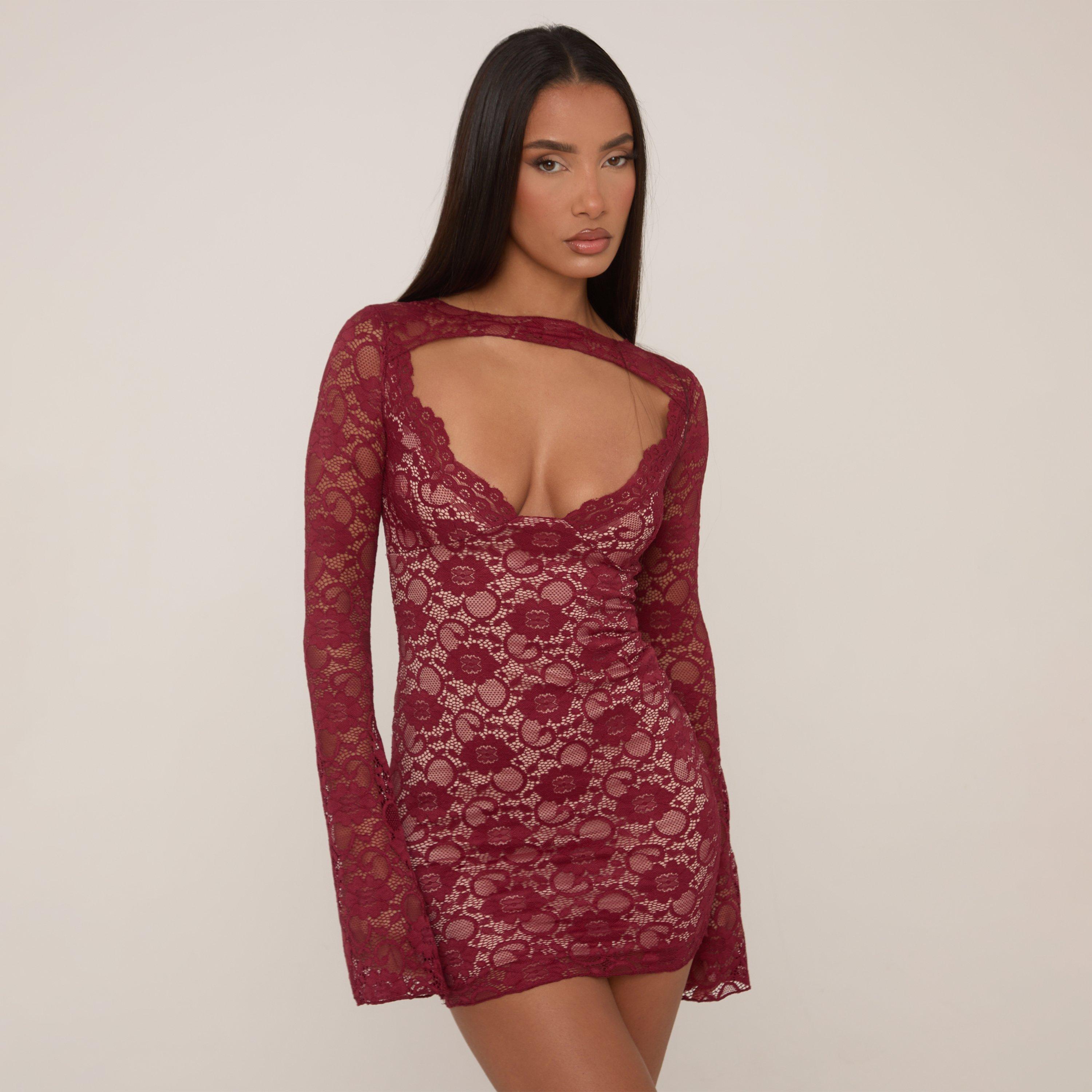 Long Sleeve Plunge Cut Out Front Mini Dress In Burgundy Lace