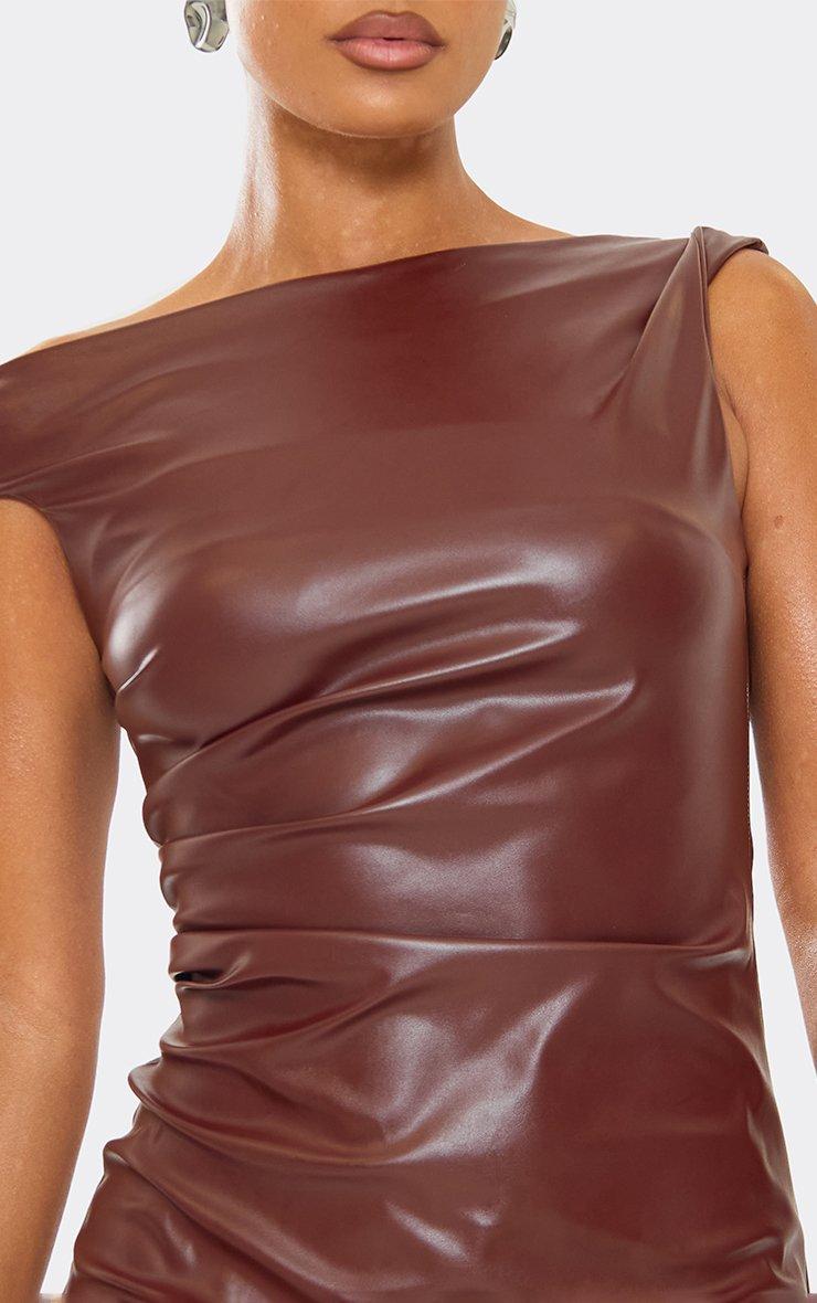 Asymmetric Strap Ruched Mini Bodycon Dress In Chocolate Brown Faux Leather
