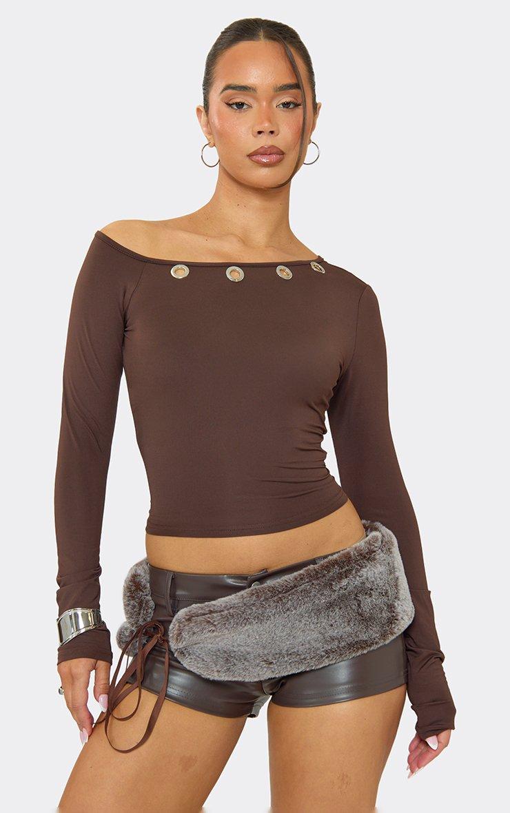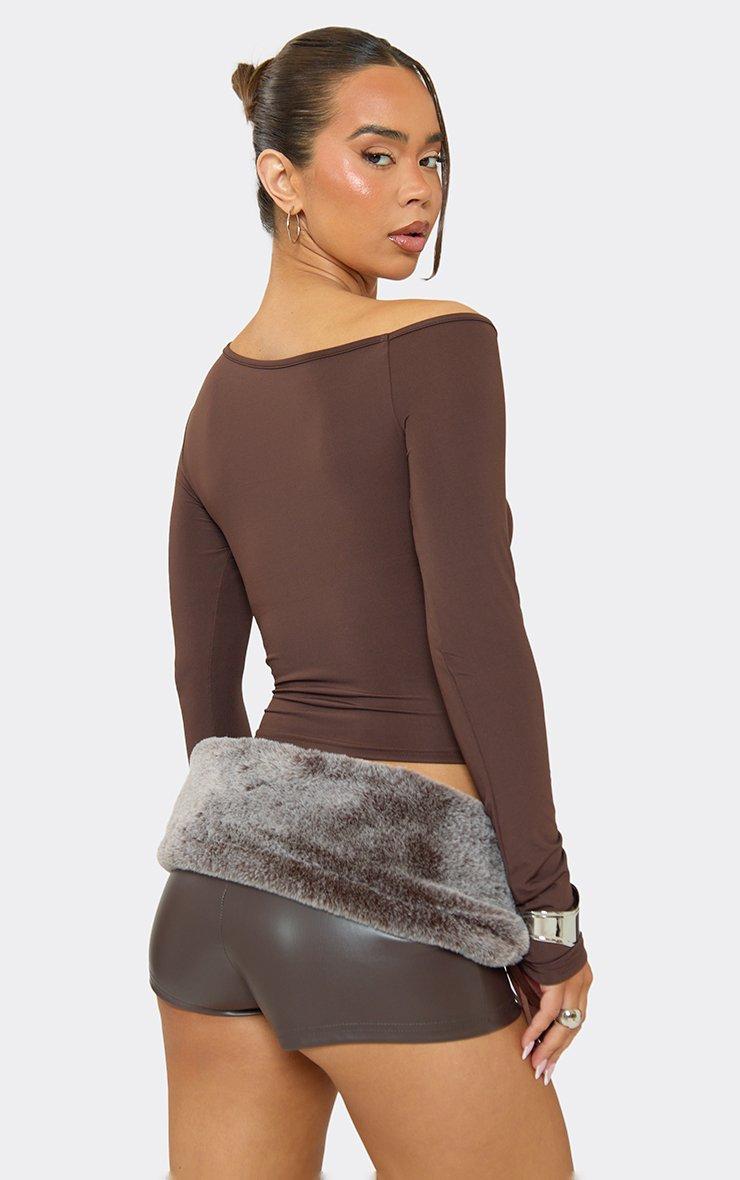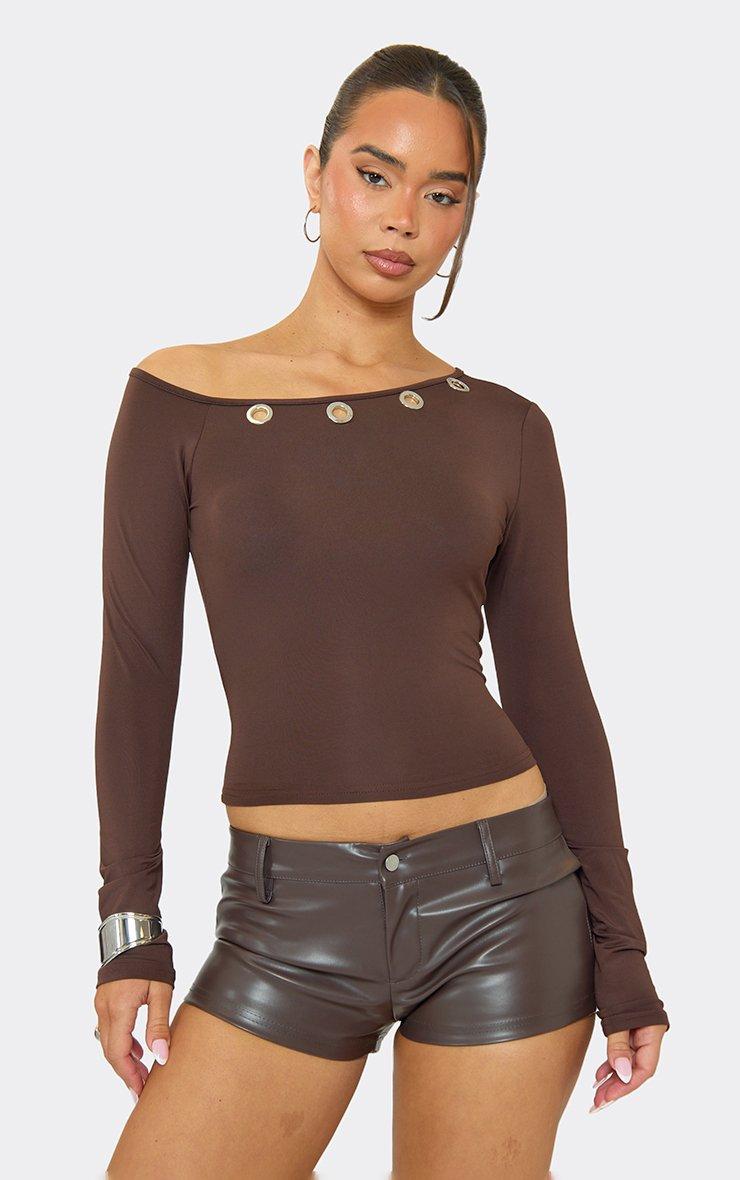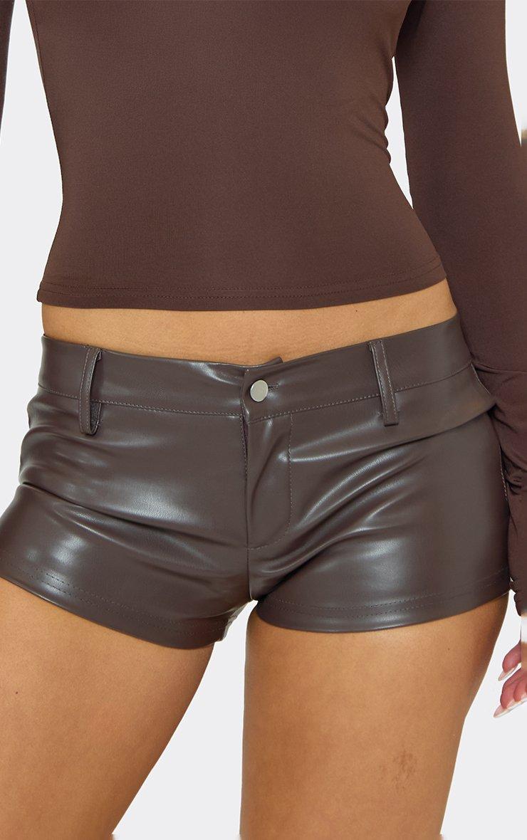 Mid Rise Belt Loop Detail Shorts In Chocolate Brown Faux Leather