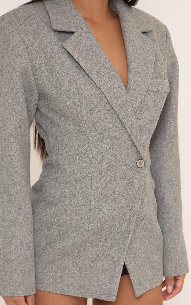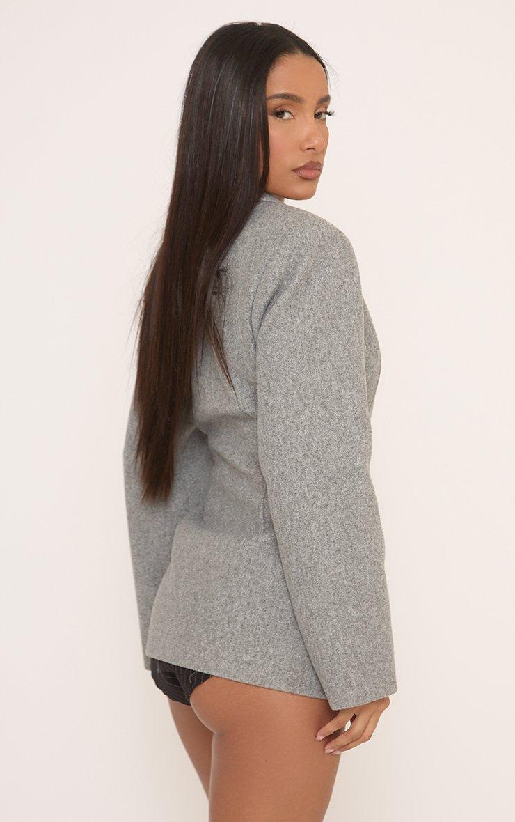 Long Sleeve Cinched Waist Blazer Wool Look Maxi Coat In Grey