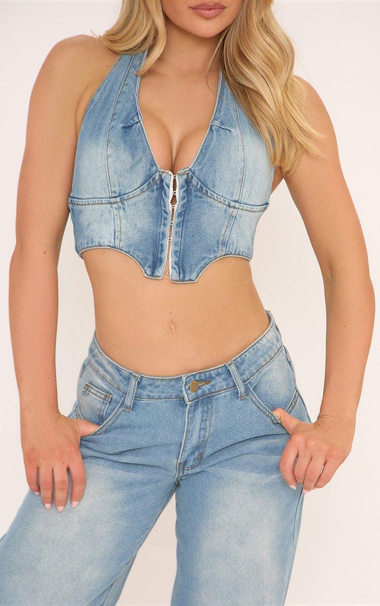 Halterneck Corset Top In Blue Denim