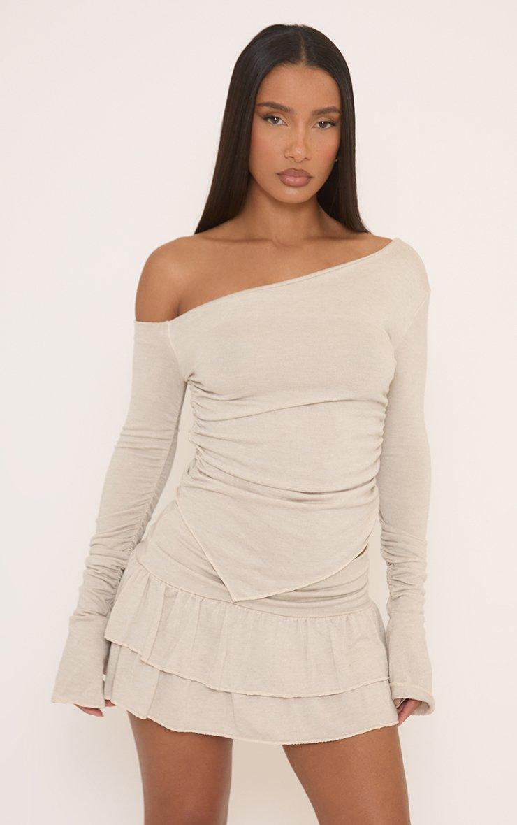 Long Sleeve Off The Shoulder Ruched Asymmetric Top In Stone Soft Knit