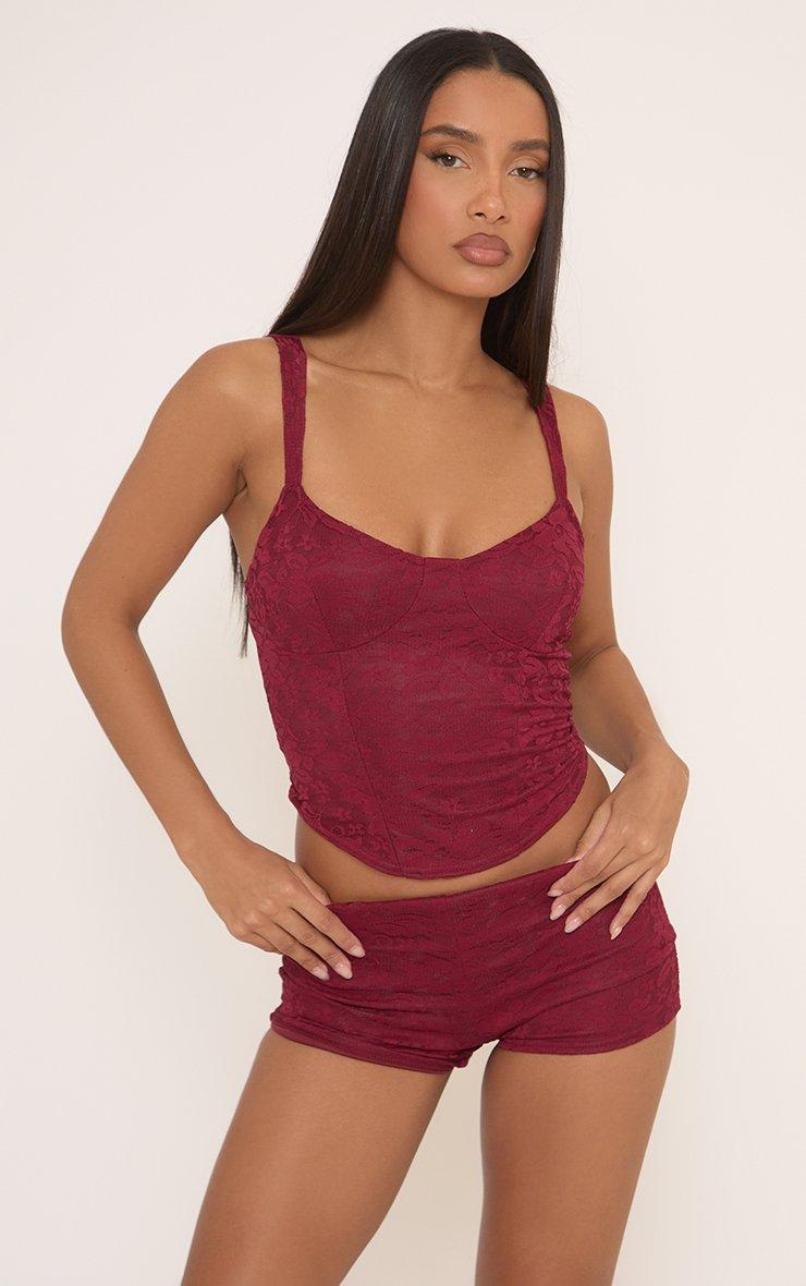 Low Rise Ruched Hot Pants In Burgundy Slinky