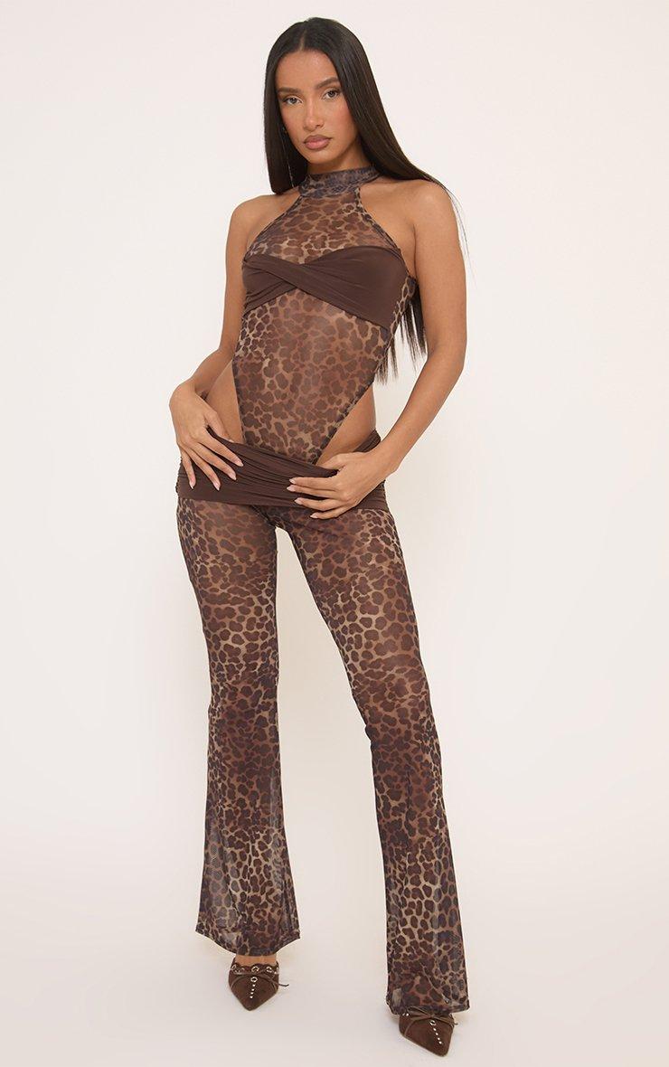 High Neck Contrast Bust Detail Bodysuit In Brown Leopard Print