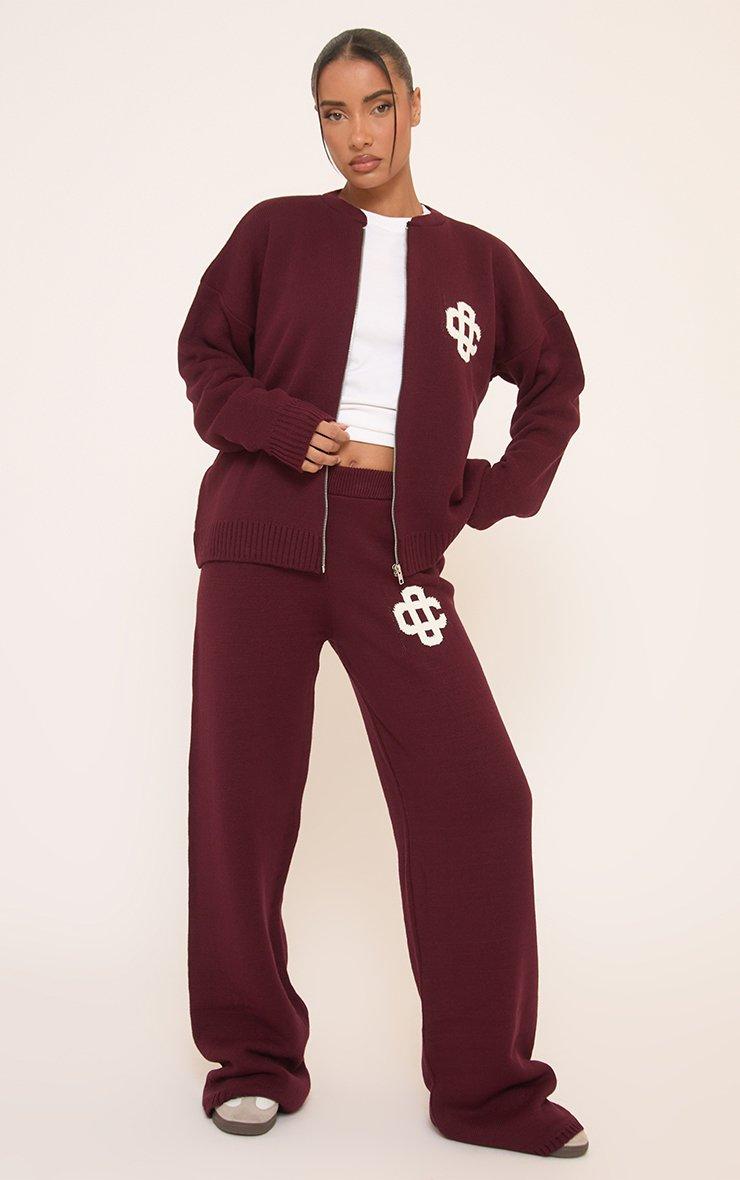 Mid Waist Ego Graphic Straight Leg Trousers In Burgundy Knit