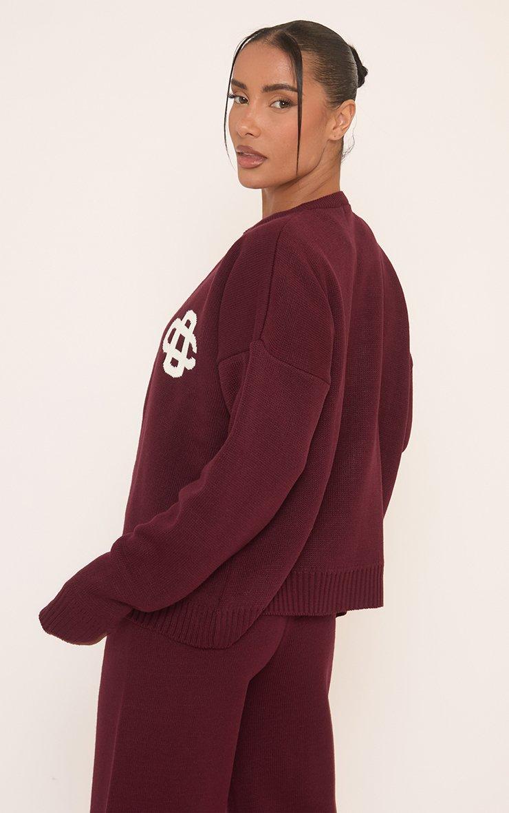 Long Sleeve Crew Neck Ego Graphic Oversized Jumper In Burgundy Knit